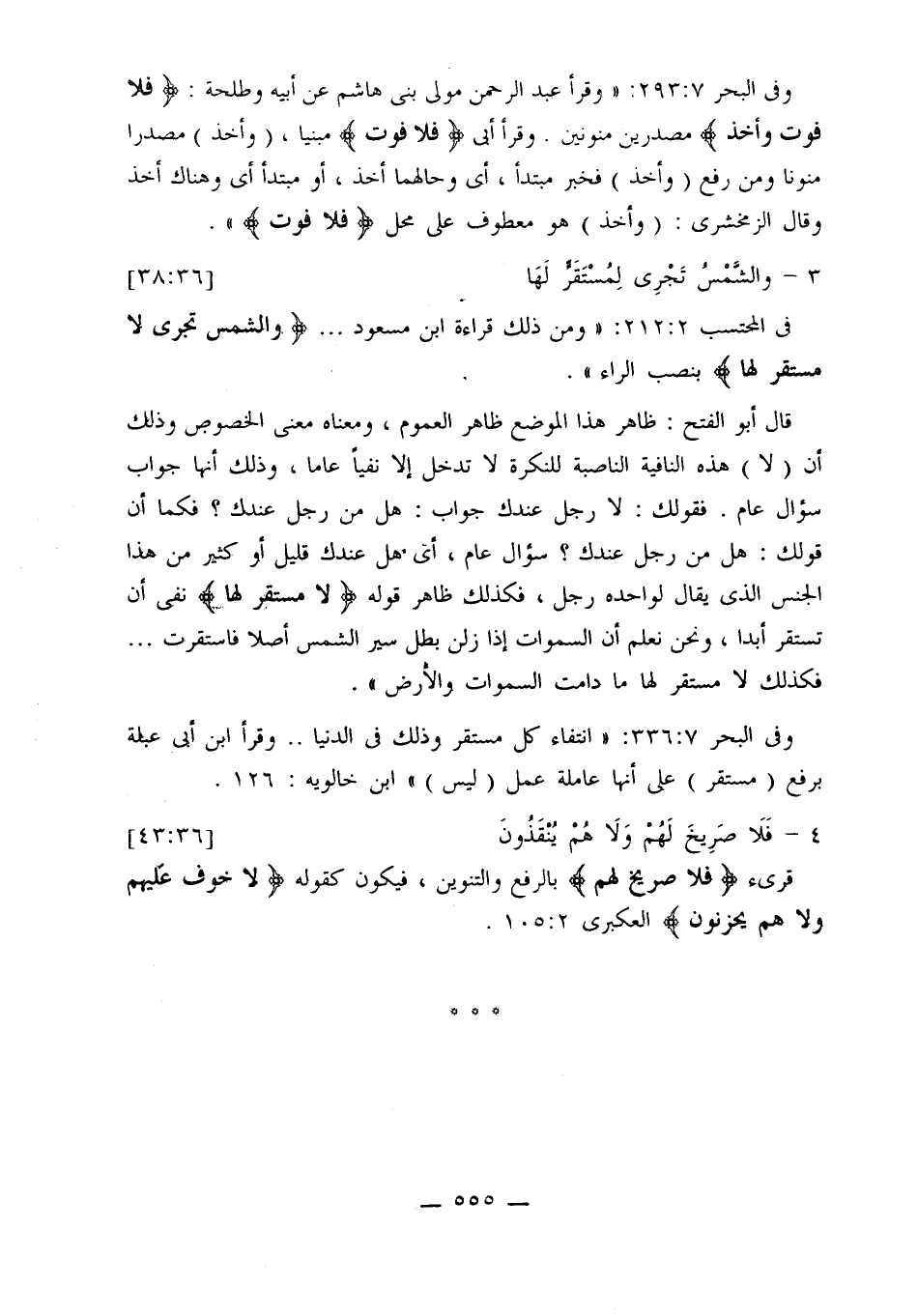 وفي البحر 7: 336: «انتفاء كل مستقر وذلك في الدنيا ... وقرأ ابن أبي عبلة برفع (مستقر) على أنها عاملة عمل (ليس)». ابن خالويه: 126.