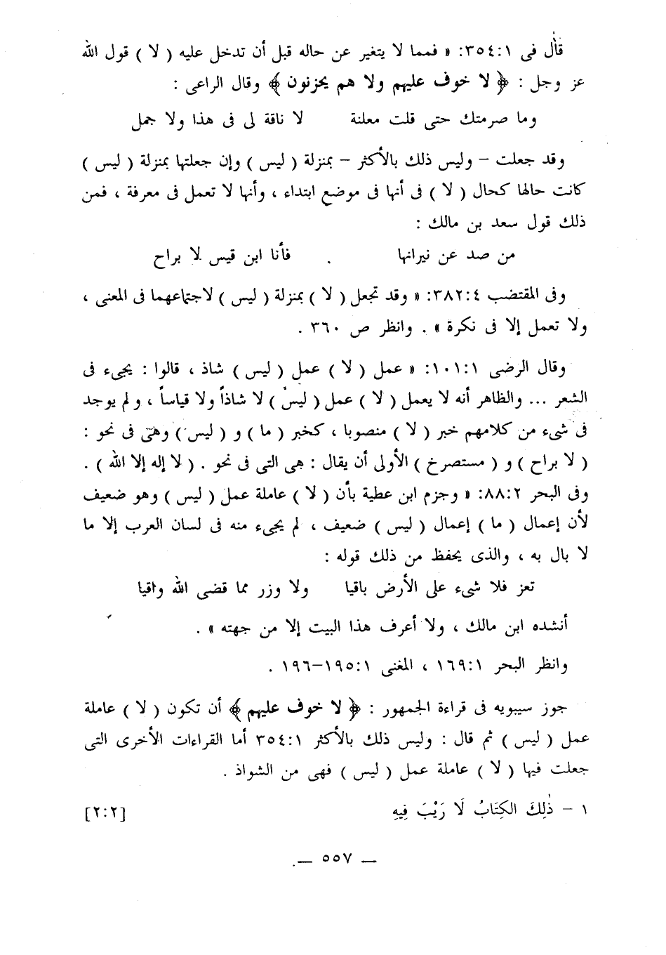 قال في 1: 354: «فمما لا يتغير عن حاله قبل أن تدخل عليه (لا) قول الله عز وجل: {لا خوف عليهم ولا هم يحزنون} وقال الراعي: