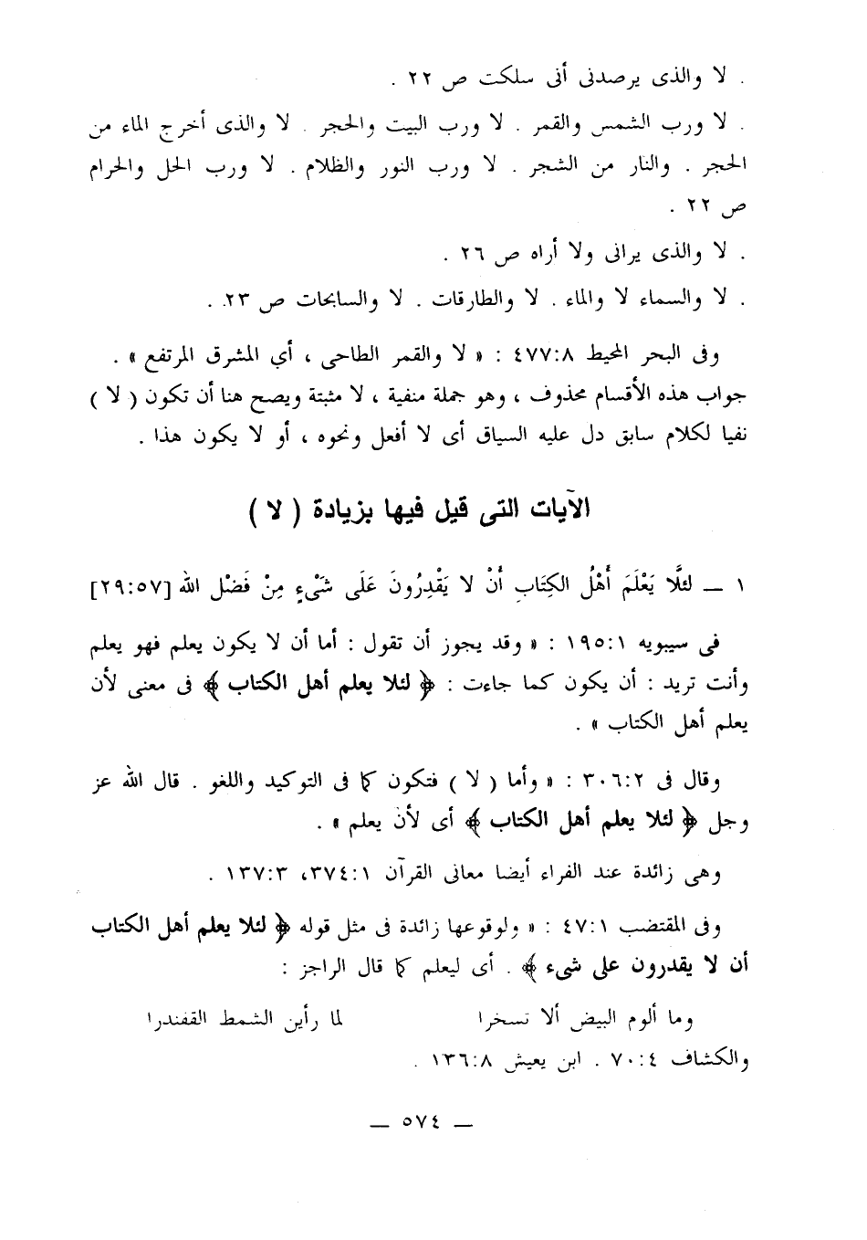 وفي المقتضب 1: 47: «ولوقوعها زائدة في مثل قوله {لئلا يعلم أهل الكتاب أن لا يقدرون على شيء}. أي ليعلم كما قال الراجز: