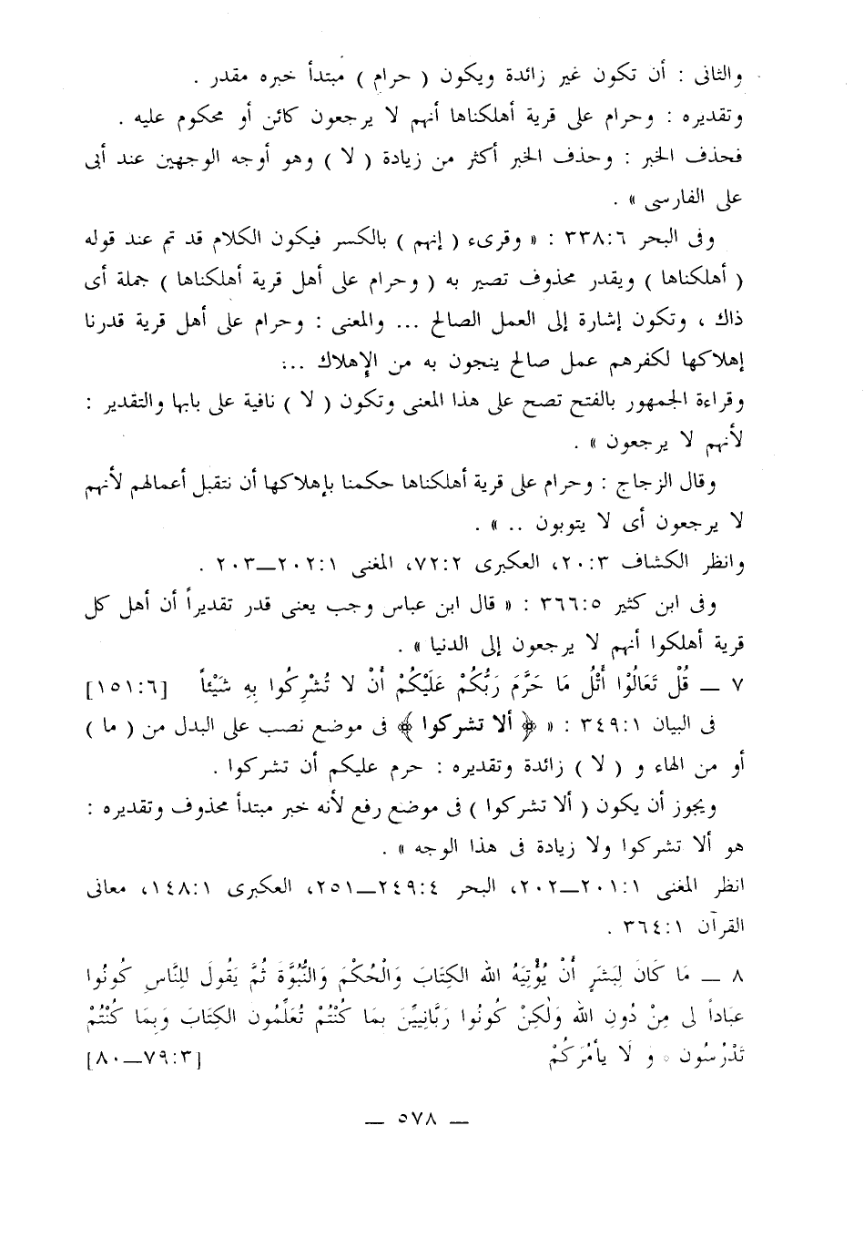 وفي البحر 6: 338: «وقرئ (إنهم) بالكسر فيكون الكلام قد تم عند قوله (أهلكناها) ويقدر محذوف تصير به (وحرام على أهل قرية أهلكناها) جملة أي ذاك، وتكون إشارة إلى العمل الصالح ... والمعنى: وحرام على أهل قرية قدرنا إهلاكها لكفرهم عمل صالح ينجون به من الإهلاك ...
