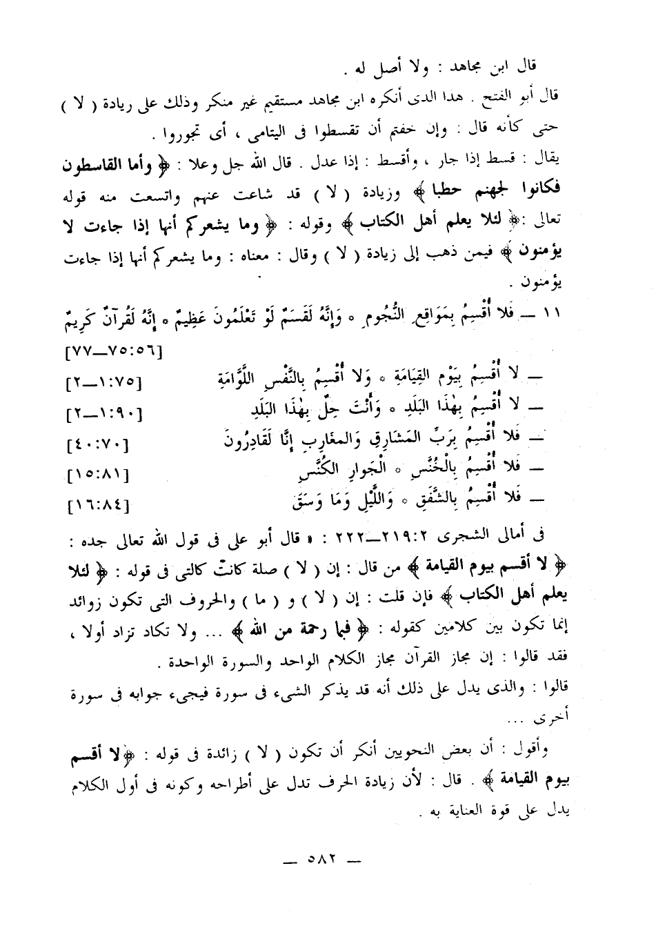 في أمالي الشجري 2: 219 - 222: «قال أبو علي في قول الله تعالى جده: {لا أقسم بيوم القيامة} من قال: إن (لا) صلة كانت كالتي في قوله: {لئلا يعلم أهل الكتاب} فإن قلت: إن (لا) و (ما) والحروف التي تكون زوائد إنما تكون بين كلامين كقوله: {فبما رحمة من الله} ... ولا تكاد تزاد أولا، فقد قالوا: إن مجاز القرآن مجاز الكلام الواحد والسورة الواحدة.