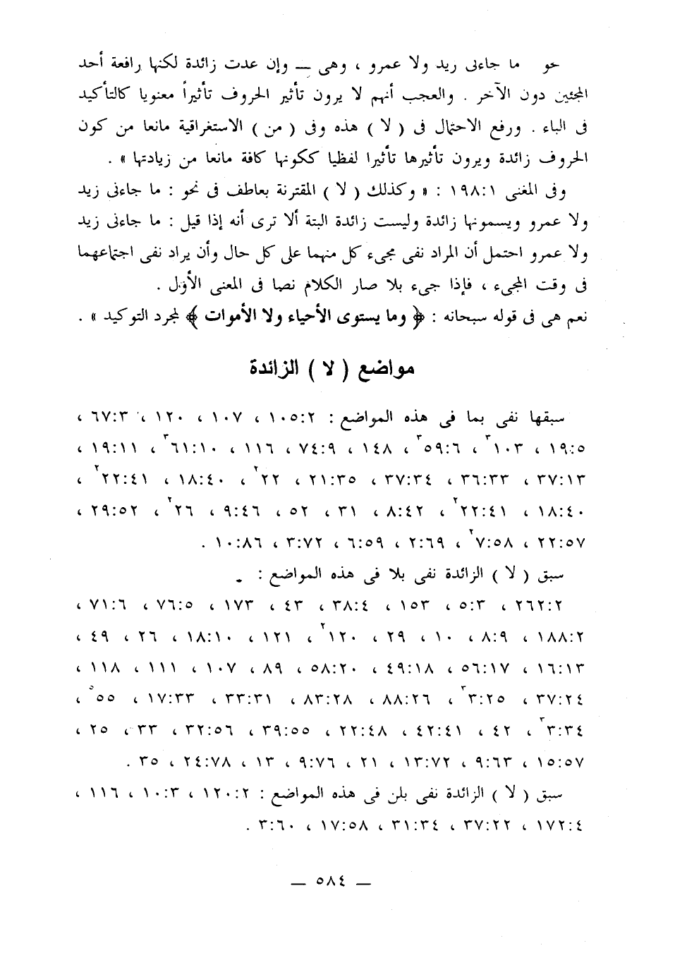 وفي المغني 1: 198: «وكذلك (لا) المقترنة بعاطف في نحو: ما جاءني زيد ولا عمرو ويسمونها زائدة وليست زائدة البتة ألا ترى أنه إذا قيل: ما جاءني زيد ولا عمرو احتمل أن المراد نفي مجيء كل منهما على كل حال وأن يراد نفي اجتماعهما في وقت المجيء، فإذا جيء بلا صار الكلام نصا في المعنى الأول.