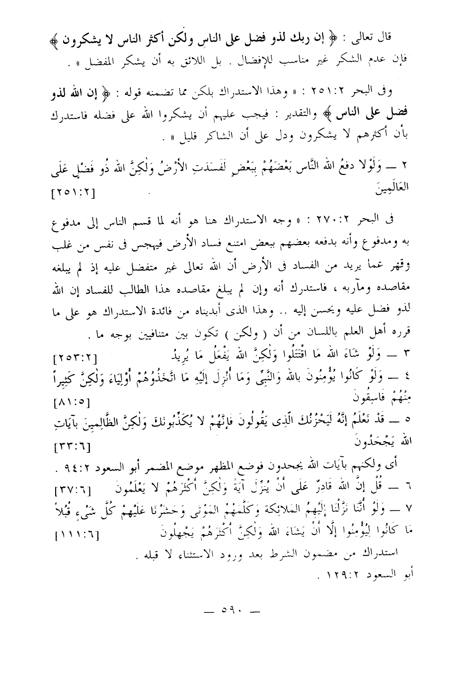 وفي البحر 2: 251: «وهذا الاستدراك بلكن مما تضمنه قوله: {إن الله لذو فضل على الناس} والتقدير: فيجب عليهم أن يشكروا الله على فضله فاستدرك بأن أكثرهم لا يشكرون ودل على أن الشاكر قليل».