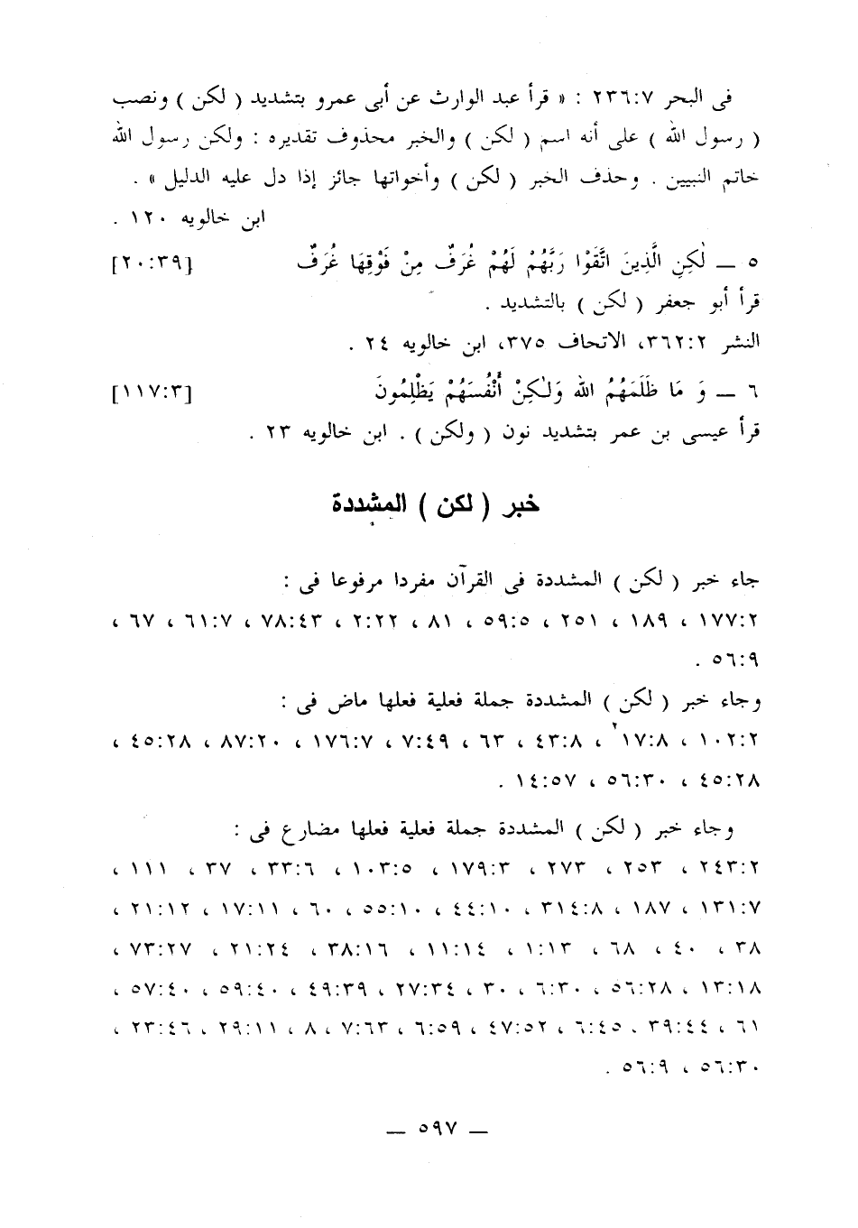 في البحر 7: 236: "قرأ عبد الوارث عن أبي عمرو بتشديد (لكن) ونصب (رسول الله) على أنه اسم (لكن) والخبر محذوف تقديره: ولكن رسول الله خاتم النبيين. وحذف الخبر (لكن) وأخواتها جائز إذا دل عليه الدليل". ابن خالوية 120.
