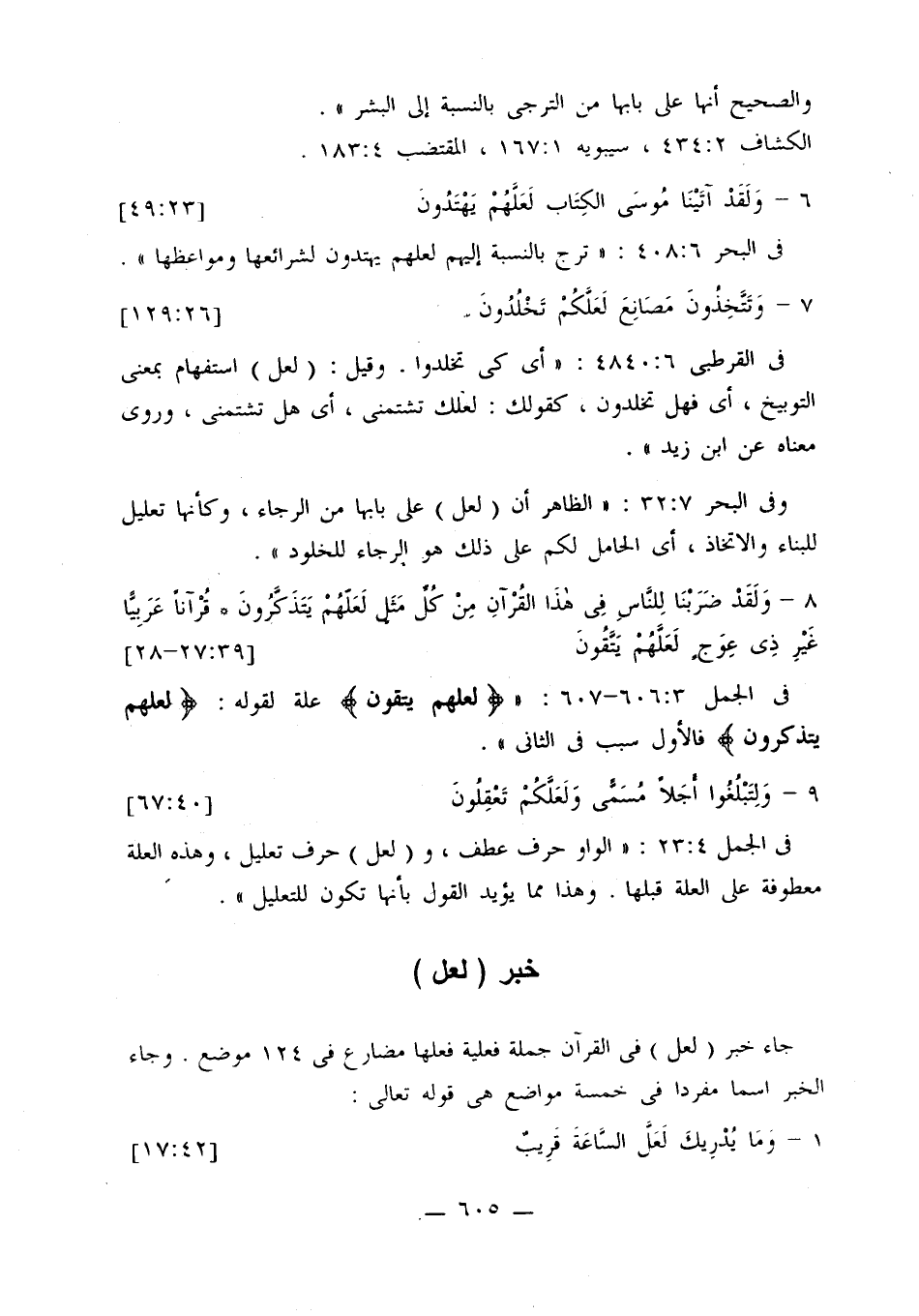 في الجمل 4: 23: «الواو حرف عطف، و (لعل) حرف تعليل، وهذه العلة معطوفة على العلة قبلها. وهذا مما يؤيد القول بأنها تكون للتعليل».