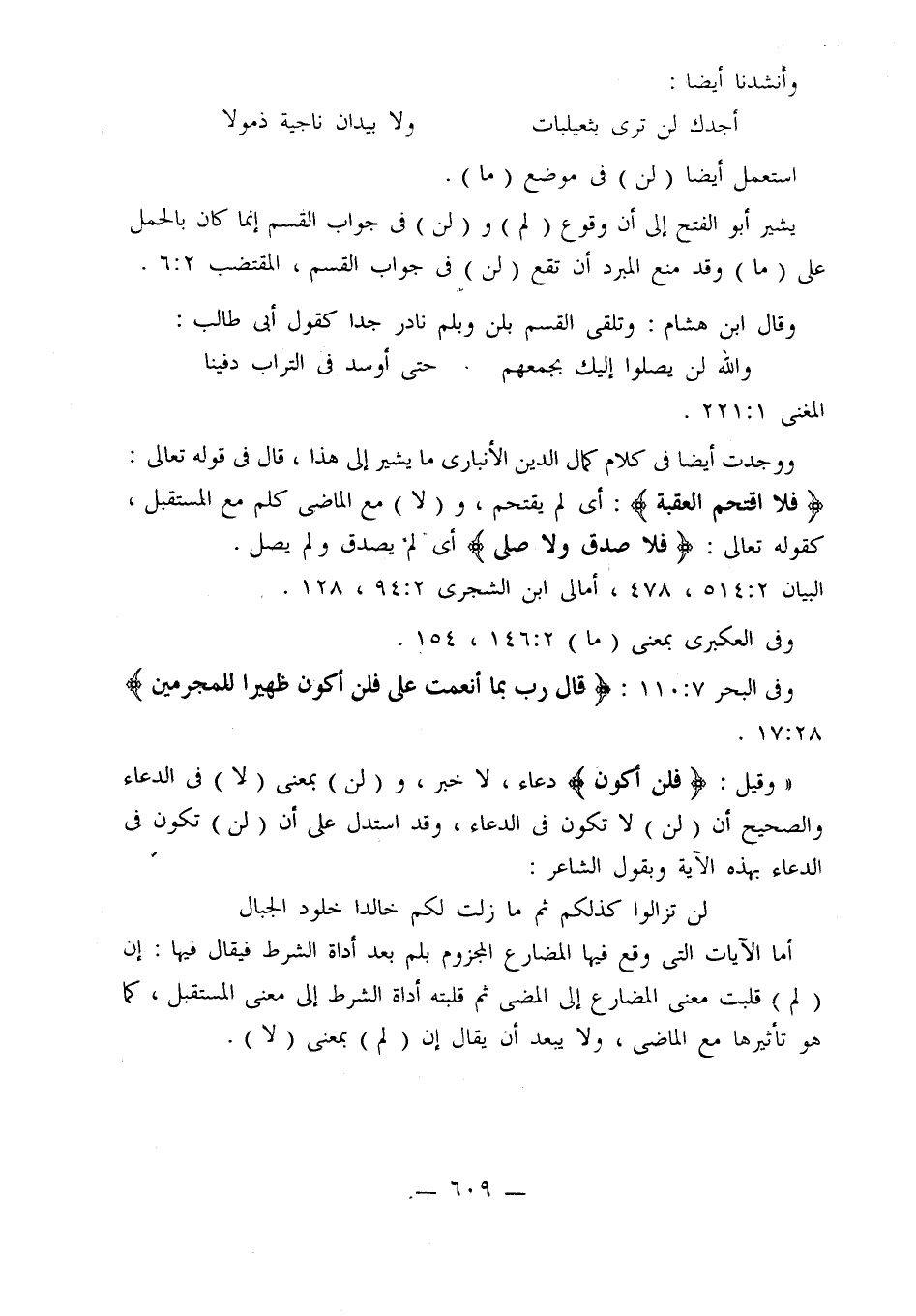 ووجدت أيضًا في كلام كمال الدين الأنباري ما يشير إلى هذا، قال في قوله تعالى: {فلا اقتحم العقبة}: أي لم يقتحم، و (لا) مع الماضي كلم مع المستقبل، كقوله تعالى: {فلا صدق ولا صلى} أي لم يصدق ولم يصل.