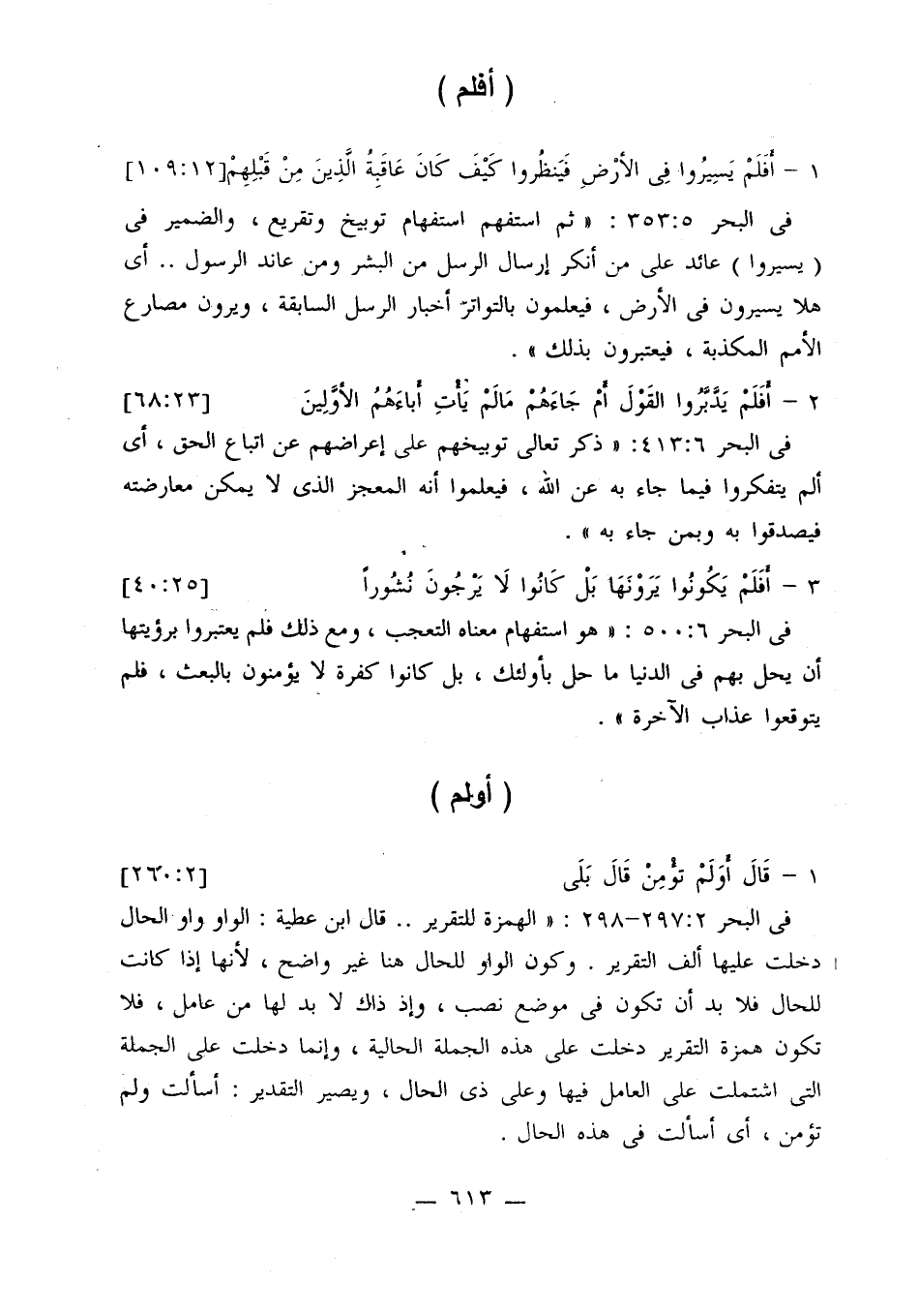 في البحر 5: 353: «ثم استفهم استفهام توبيخ وتقريع، والضمير في (يسيروا) عائد على من أنكر إرسال الرسل من البشر ومن عاند الرسول ... أي هلا يسيرون في الأرض، فيعلمون بالتواتر أخبار الرسل السابقة، ويرون مصارع الأمم المكذبة، فيعتبرون بذلك».