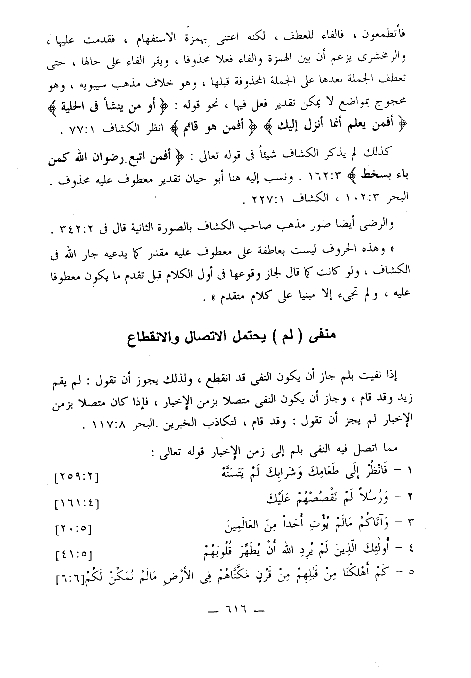 كذلك لم يذكر الكشاف شيئًا في قوله تعالى: {أفمن اتبع رضوان الله كمن باء بسخط} 3: 162. ونسب إليه هنا أبو حيان تقدير معطوف عليه محذوف. البحر 3:102، الكشاف 1: 227.