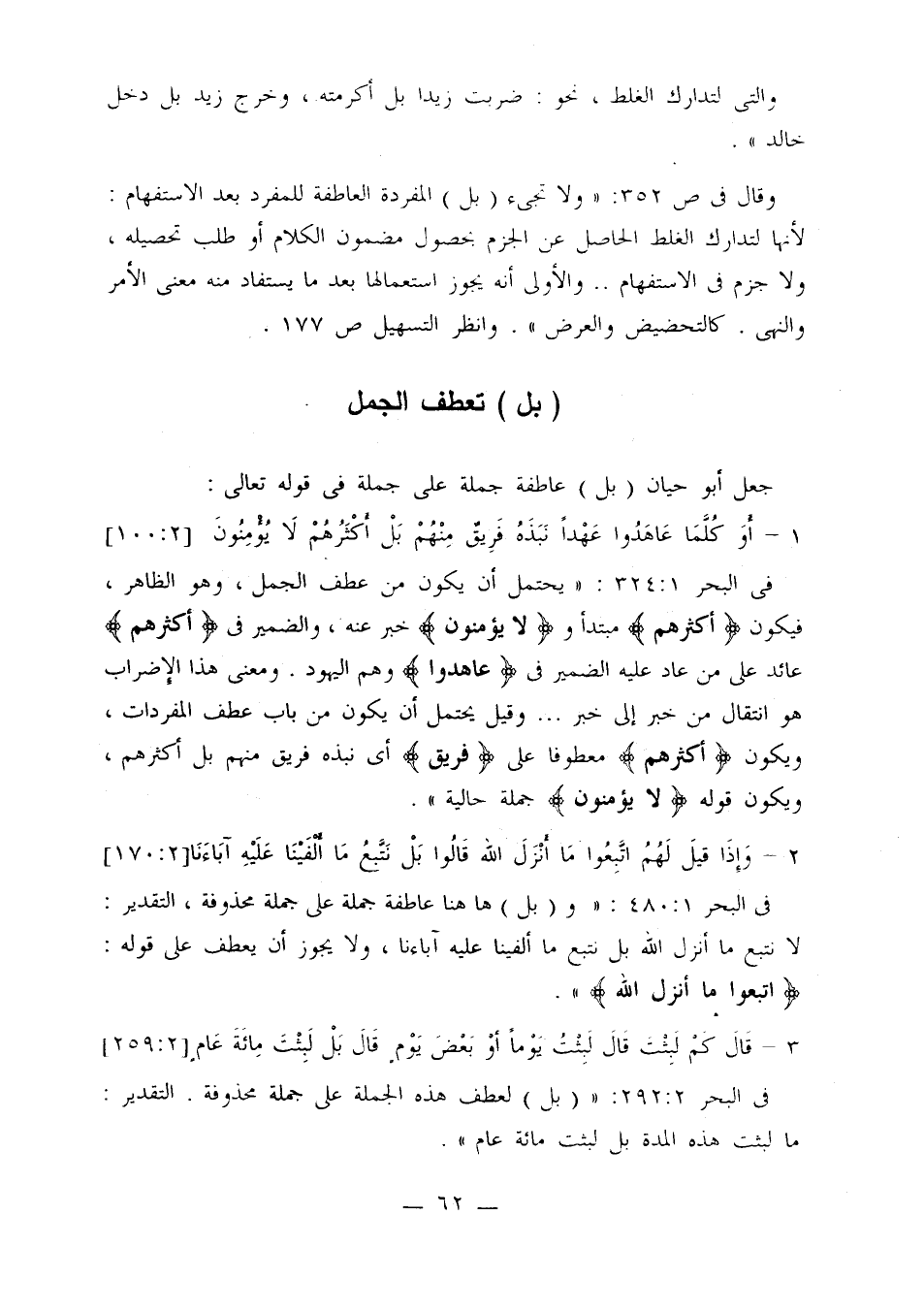 وقال في ص 352: «ولا تجيء (بل) المفردة العاطفة للمفرد بعد الاستفهام: لأنها لتدارك الغلط الحاصل عن الجزم بحصول مضمون الكلام أو طلب تحصيله، ولا جزم في الاستفهام ... والأولى أنه يجوز استعمالها بعد ما يستفاد منه معنى الأمر والنهي. كالتحضيص والعرض». وانظر التسهيل ص 177.