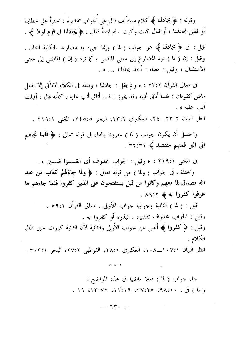 وقيل: إن (لما) ترد المضارع إلى معنى الماضي، كما ترد (إن) الماضي إلى معنى الاستقبال، وقيل: معناه: أخذ يجادلنا ...».