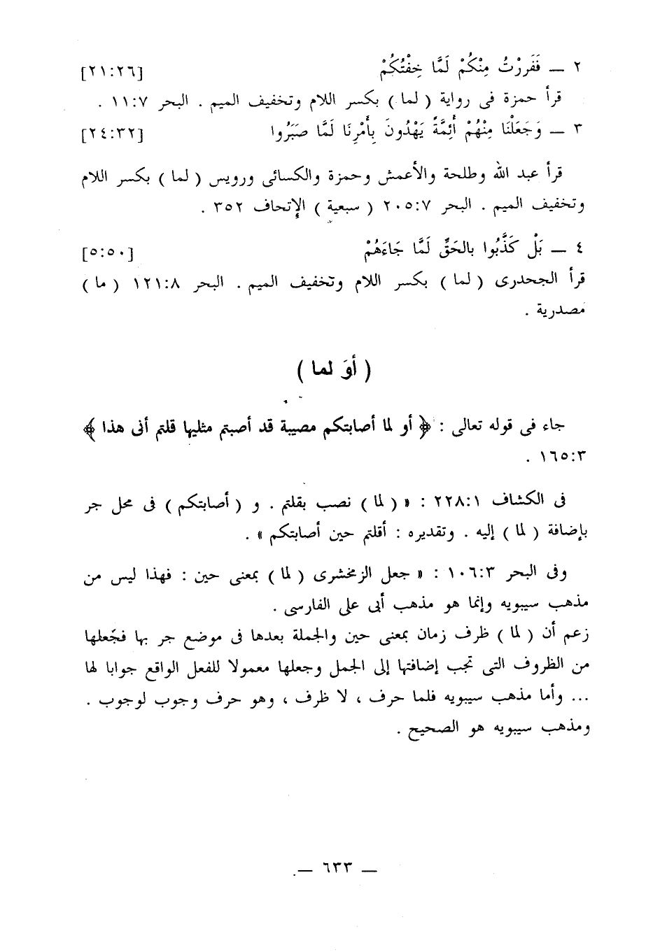 وفي البحر 3: 106: «جعل الزمخشري (لما) بمعنى حين: فهذا ليس من مذهب سيبويه وإنما هو مذهب أبي على الفارسي.