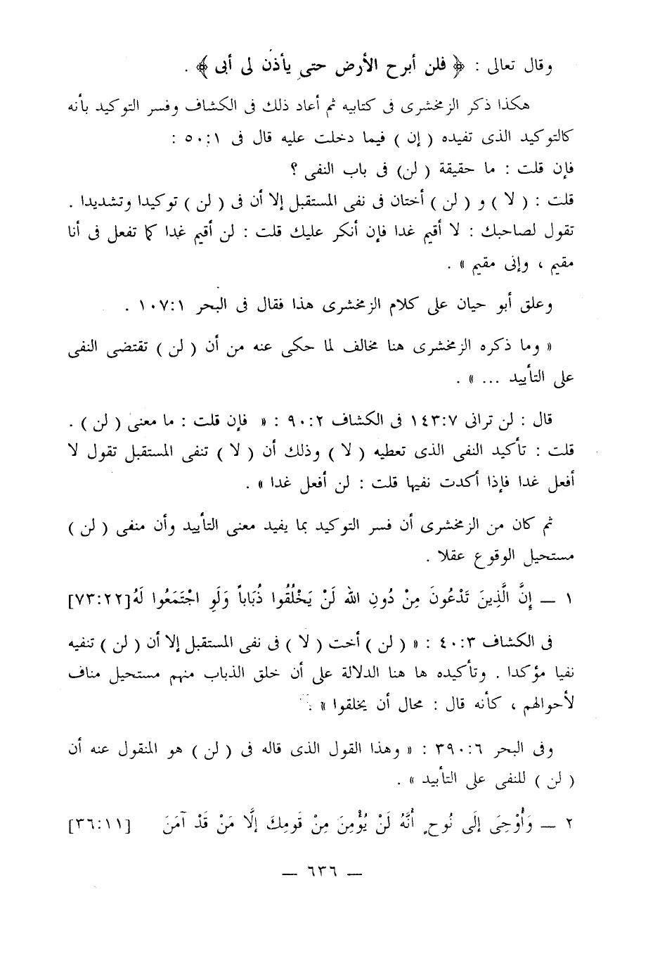 قال: لن تراني 7: 143 في الكشاف 2: 90: «فإن قلت: ما معنى (لن) قلت: تأكيد النفي الذي تعطيه (لا) وذلك أن (لا) تنفي المستقبل تقول لا أفعل غدا فإذا أكدت نفيها قلت: لن أفعل غدا».