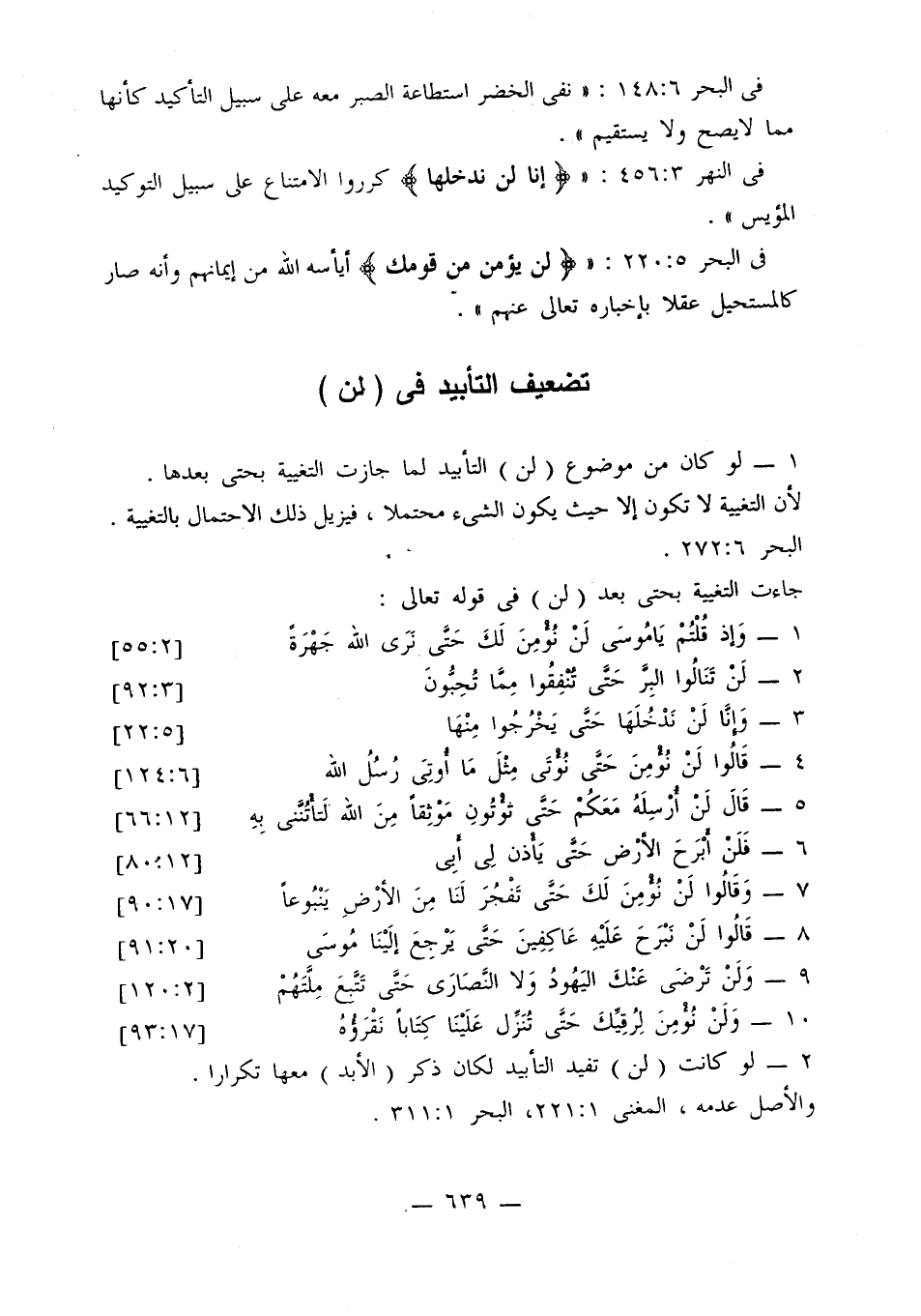 2 - لو كانت (لن) تفيد التأبيد لكان ذكر (الأبد) معها تكرارا. والأصل عدمه، المغني 1: 221، البحر 1: 311.