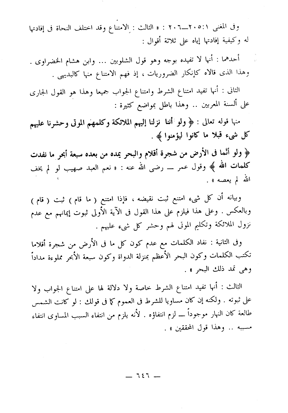 الثالث: أنها تفيد امتناع الشرط خاصة ولا دلالة لها على امتناع الجواب ولا على ثبوته. ولكنه إن كان مساويًا للشرط في العموم كما في قولك: لو كانت الشمس طالعة كان النهار موجودًا - لزم انتفاؤه. لأنه يلزم من انتفاء السبب المساوي انتفاء مسببه ... وهذا قول المحققين.