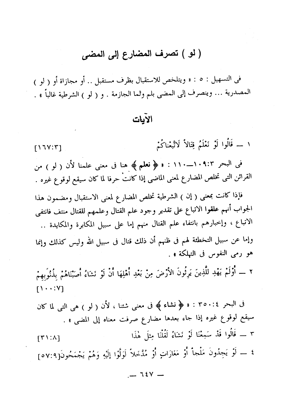في البحر 3: 109 - 110: «{نعلم} هنا في معنى علمنا لأن (لو) من القرائن التي تخلص المضارع لمعنى الماضي إذا كانت حرفا لما كان سيقع لوقوع غيره.