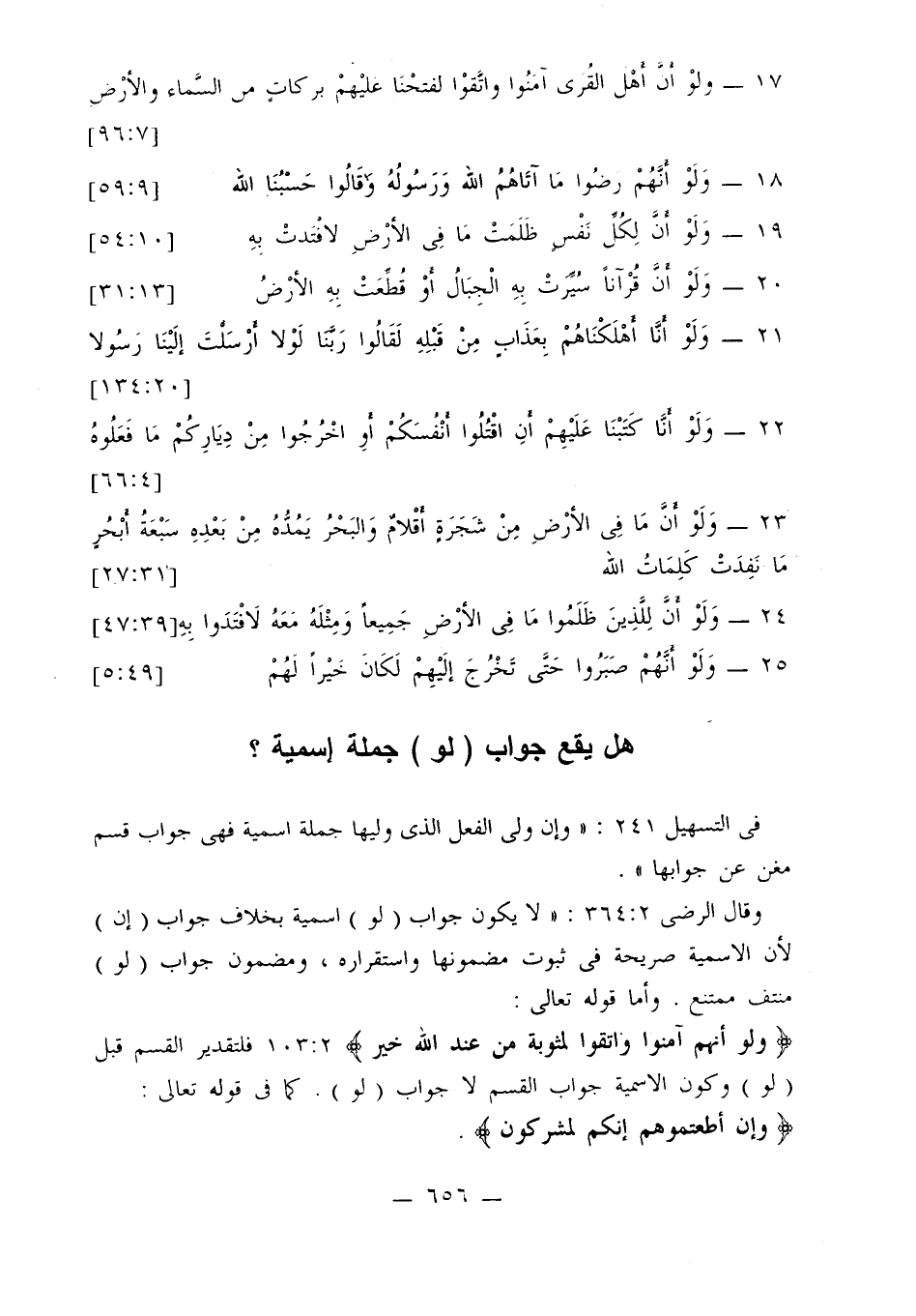 وقال الرضى 2: 364: «لا يكون جواب (لو) اسمية بخلاف جواب (إن) لأن الاسمية صريحة في ثبوت مضمونها واستقراره، ومضمون جواب (لو) منتف ممتنع. وأما قوله تعالى:
