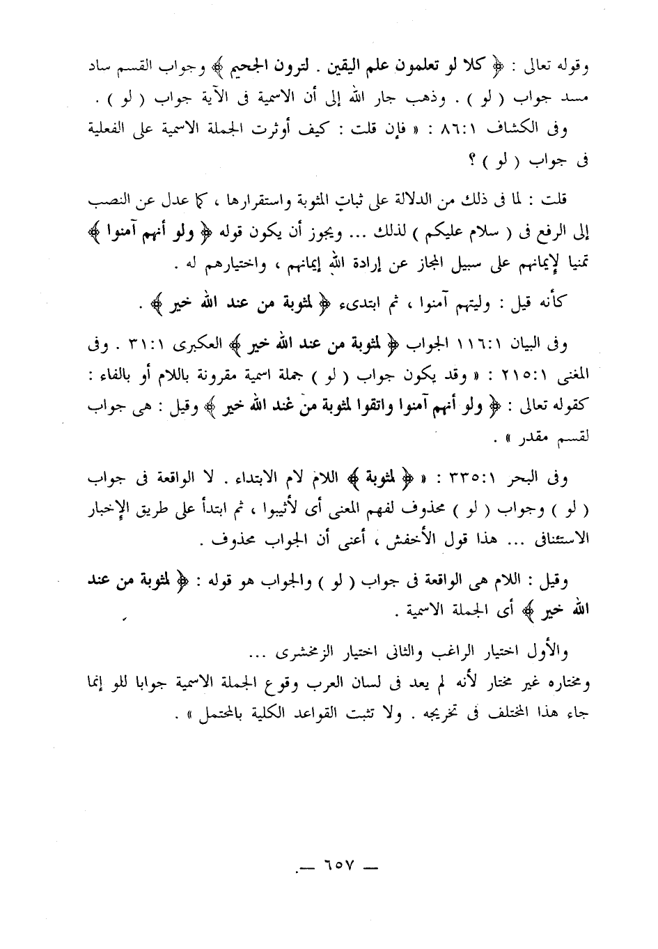 ومختاره غير مختار لأنه لم يعد في لسان العرب وقوع الجملة الاسمية جوابا للو إنما جاء هذا المختلف في تخريجه. ولا تثبت القواعد الكلية بالمحتمل».