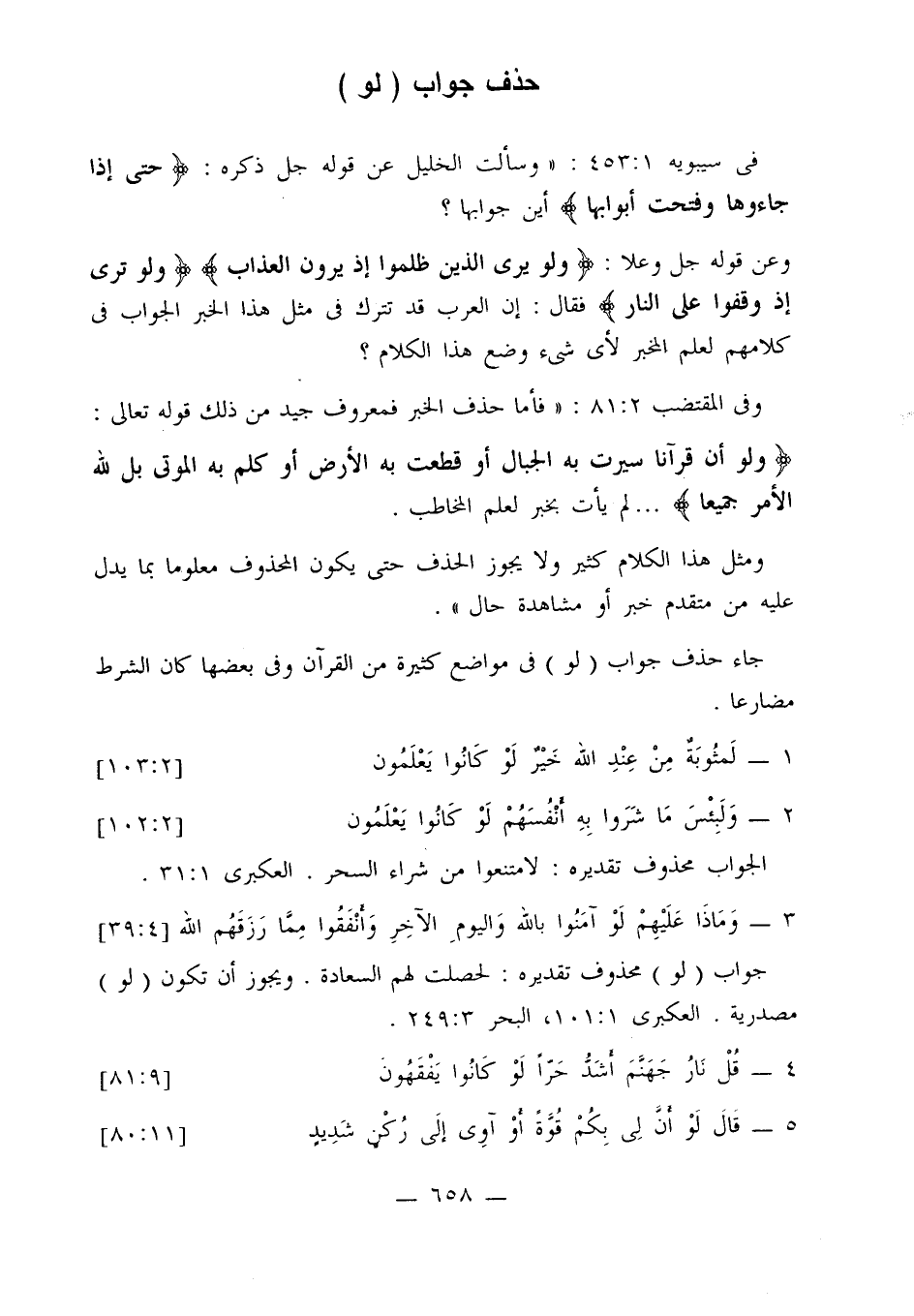 وعن قوله جل وعلا: {ولو يرى الذي ظلموا إذ يرون العذاب} {ولو ترى إذ وقفوا على النار} فقال: إن العرب قد تترك في مثل هذا الخبر الجواب في كلامهم لعلهم المخبر لأي شيء وضع هذا الكلام؟