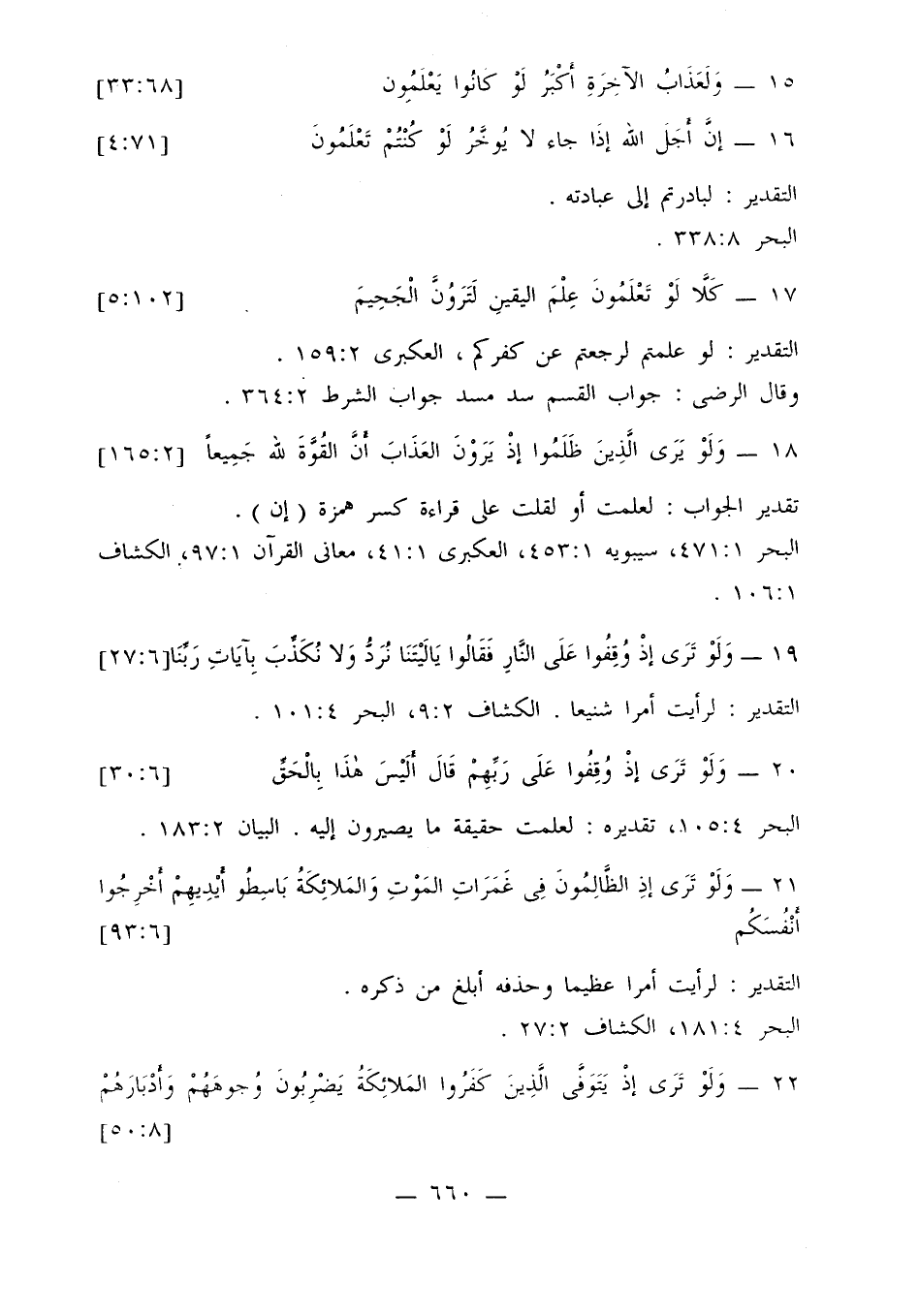 البحر 4: 105، تقديره: لعلمت حقيقة ما يصيرون إليه. البيان 2: 183.
