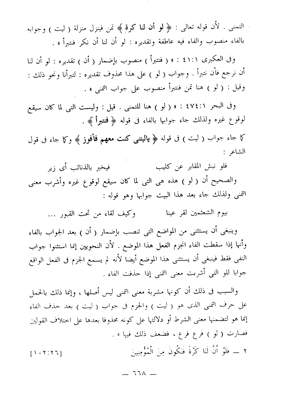 وفي العكبري 1: 41: «(فنتبرأ) منصوب بإضمار (أن) تقديره: لو أن لنا أن نرجع فأن نتبرأ. وجواب (لو) على هذا محذوف تقديره: لتبرأنا ونحو ذلك: وقيل: (لو) هنا تمن فنتبرأ منصوب على جواب التمني».