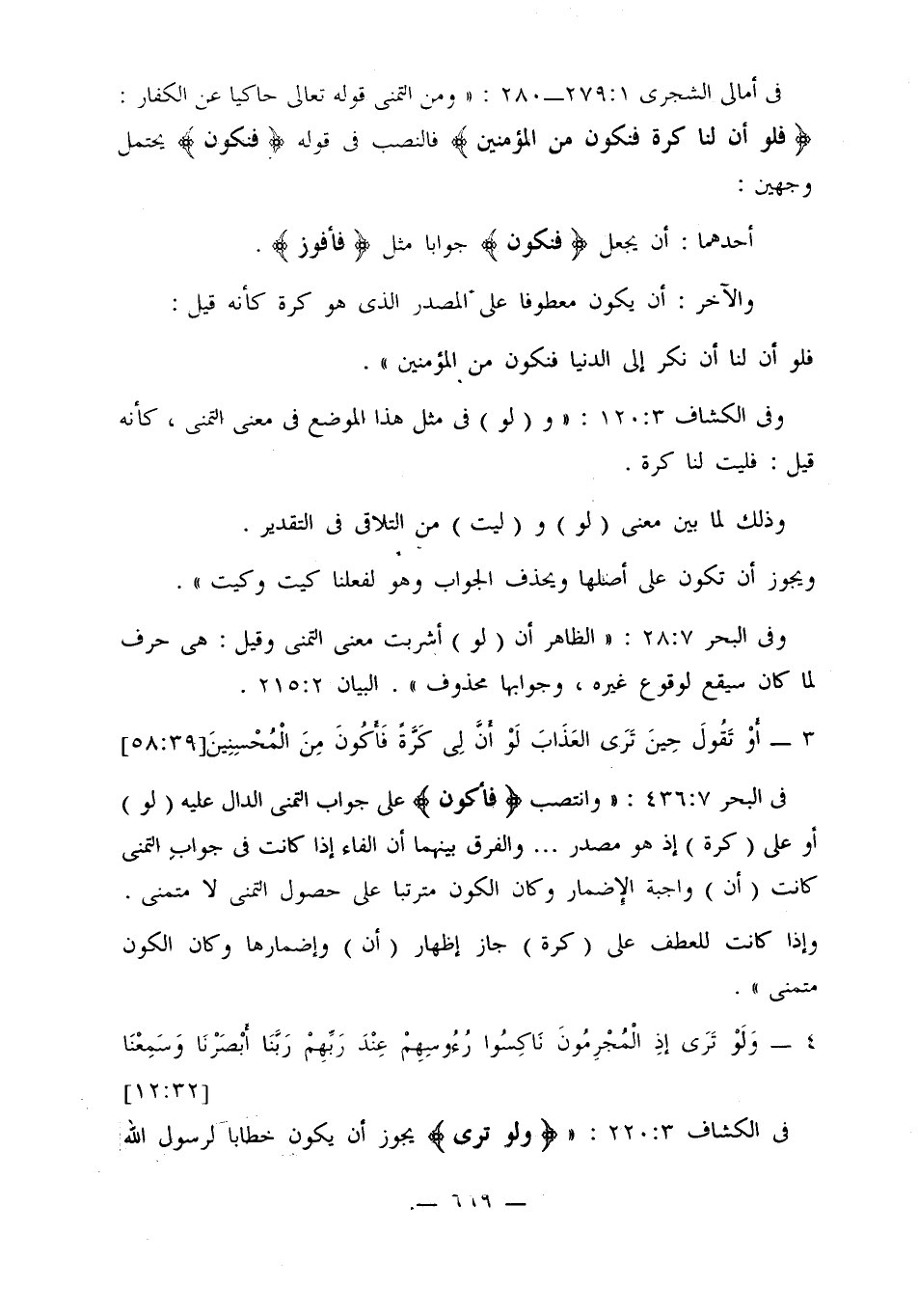 في أمالي الشجري 1: 279 - 280: «ومن التمني قوله تعالى حاكيا عن الكفار: {فلو أن لنا كرة فنكون من المؤمنين} فالنصب في قوله {فنكون} يحتمل وجهين: