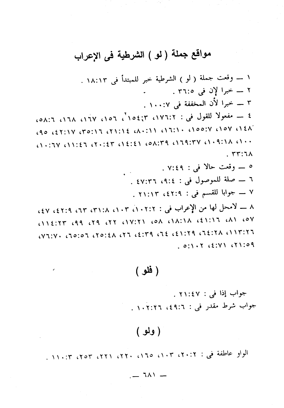 8 - لا محل لها من الإعراب في: 2: 102، 103، 8: 31، 63، 9: 42، 47، 57، 81، 16: 41، 18: 18، 58، 21: 17، 22، 29، 23: 114، 26: 113، 28: 64، 29: 41، 64، 39: 4، 26، 48: 25، 56: 65، 70: 76، 59: 21، 71: 4، 102: 5.