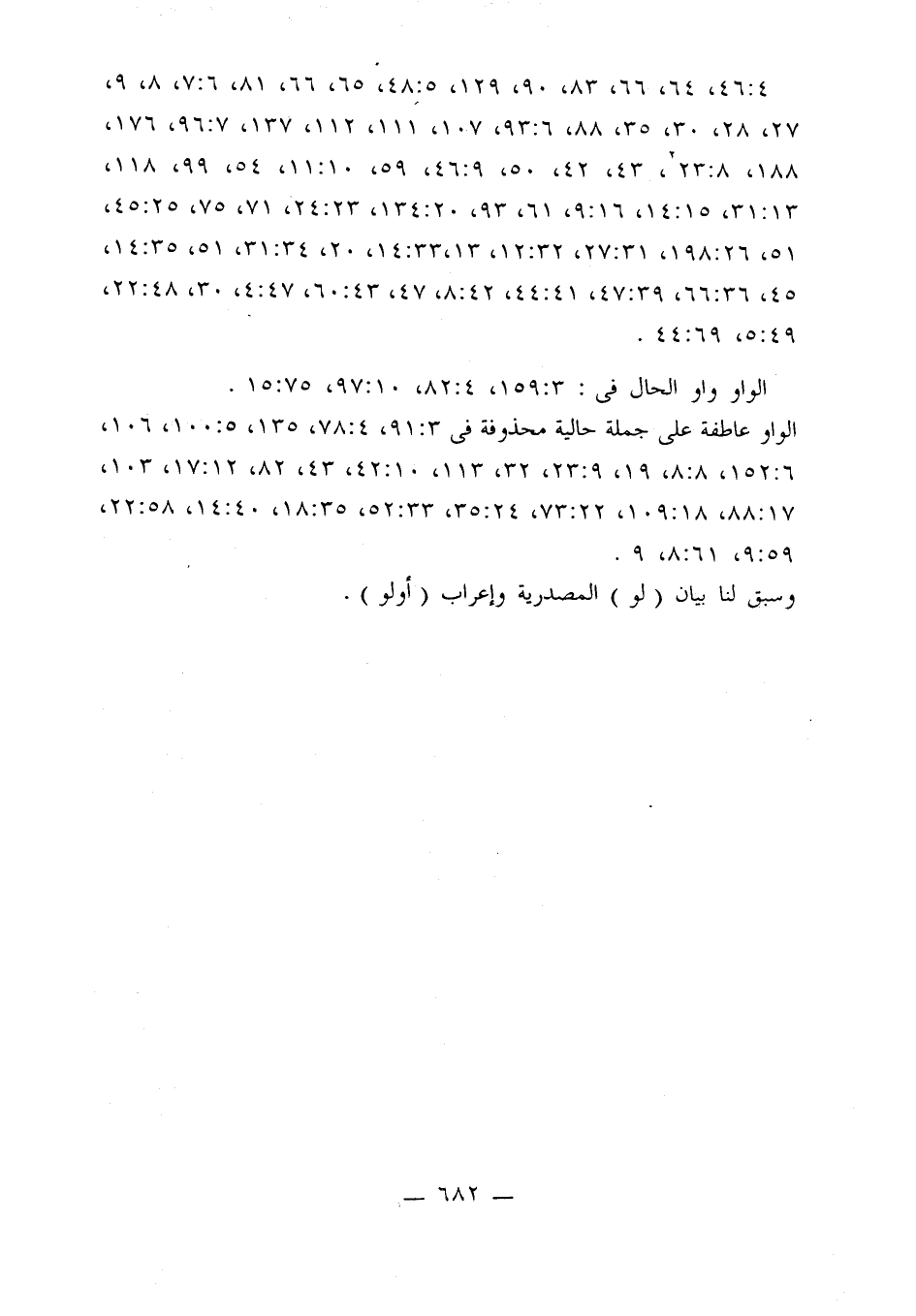 الواو عاطفة على جملة حالية محذوفة في 3: 91، 4: 78، 135، 5: 100، 106، 6: 152، 8: 8، 19، 9: 23، 32، 113، 10: 42، 43، 82، 12: 17، 103، 17: 88، 18: 109، 22: 73، 24: 35، 33: 52، 35: 18، 40: 14، 58: 22، 59: 9، 61: 8، 9.