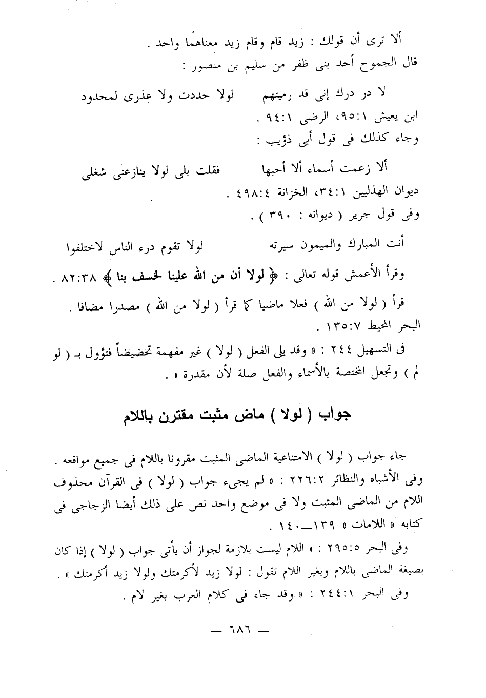وفي البحر 5: 295: «اللام ليست بلازمة لجواز أن يأتي جواب (لولا) إذا كان بصيغة الماضي باللام وبغير اللام تقول: لولا زيد لأكرمتك ولولا زيد أكرمتك».
