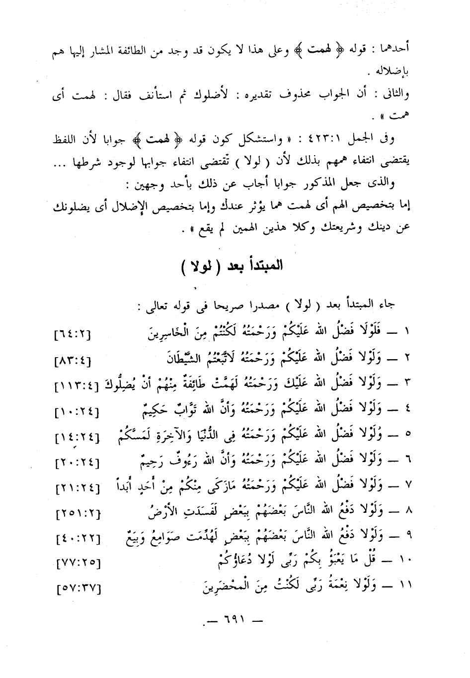 وفي الجمل 1: 423: «واستشكل كون قوله {لهمت} جوابا لأن اللفظ يقتضي انتفاء همهم بذلك لأن (لولا) تقتضي انتفاء جوابها لوجود شرطها ...