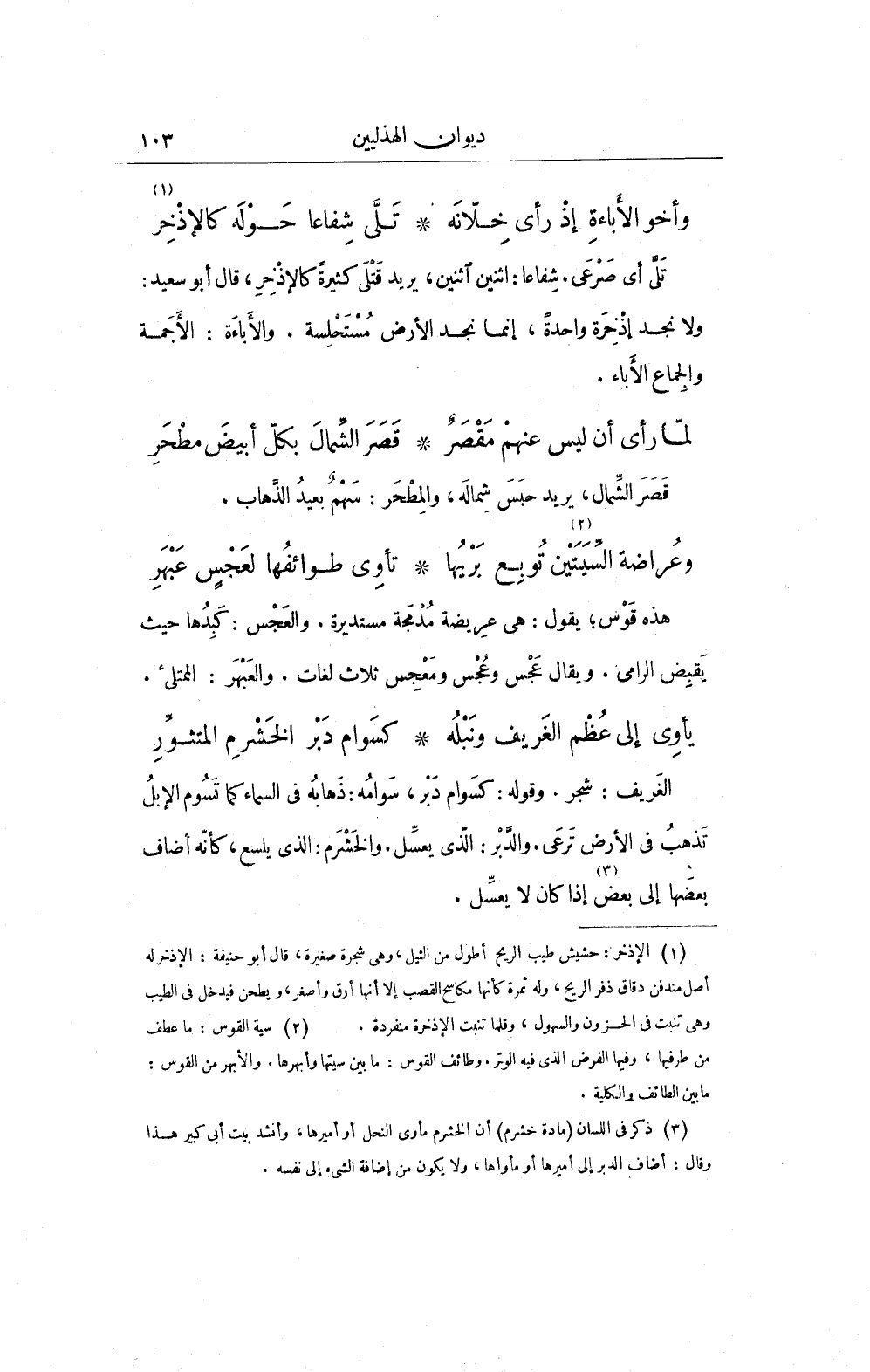 (¬3) ذكر في اللسان (مادة خشرم) أن الخشرم مأوى النحل أو أميرها، وأنشد بيت أبى كبير هذا وقال: أضاف الدبر إلى أميرها أو مأواها، ولا يكون من إضافة الشيء إلى نفسه.