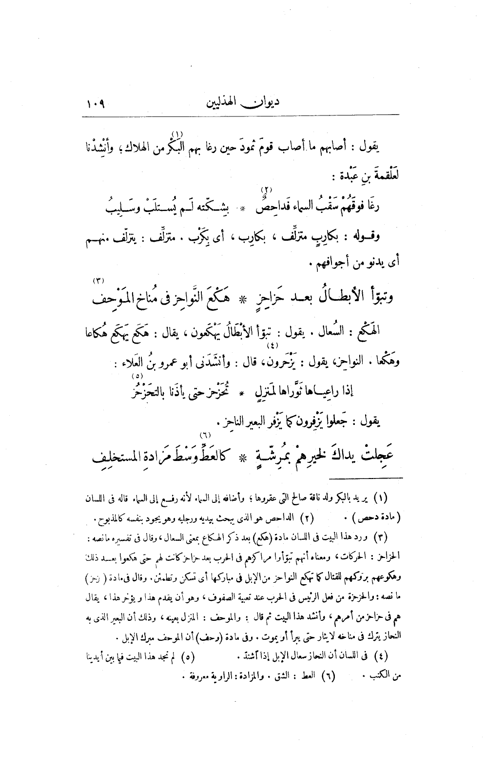 (¬3) ورد هذا البيت في اللسان مادة (هكع) بعد ذكر الهكاع بمعنى السعال، وقال في تفسيره ما نصه: الحزاحز: الحركات، ومعناه أنهم تبوّأوا مراكزهم في الحرب بعد حزاحز كانت لهم حتى هكعوا بعد ذلك وهكوعم بروكهم للقتال كما تهكع النواحز من الإبل في مباركها أي تسكن وتطمئن. وقال في مادة (زحز) ما نصه: والحزحزة من فعل الرئيس في الحرب عند تعبية الصفوف، وهو أن يقدم هذا ويؤخر هذا، يقال هم في حزاحز من أمرهم، وأنشد هذا البيت ثم قال: والموحف: المنزل بعينه، وذلك أن البعير الذي به النحاز يترك في مناخه لا يثار حتى يبرأ أو يموت. وفي مادة (وحف) أن الموحف مبرك الإبل.