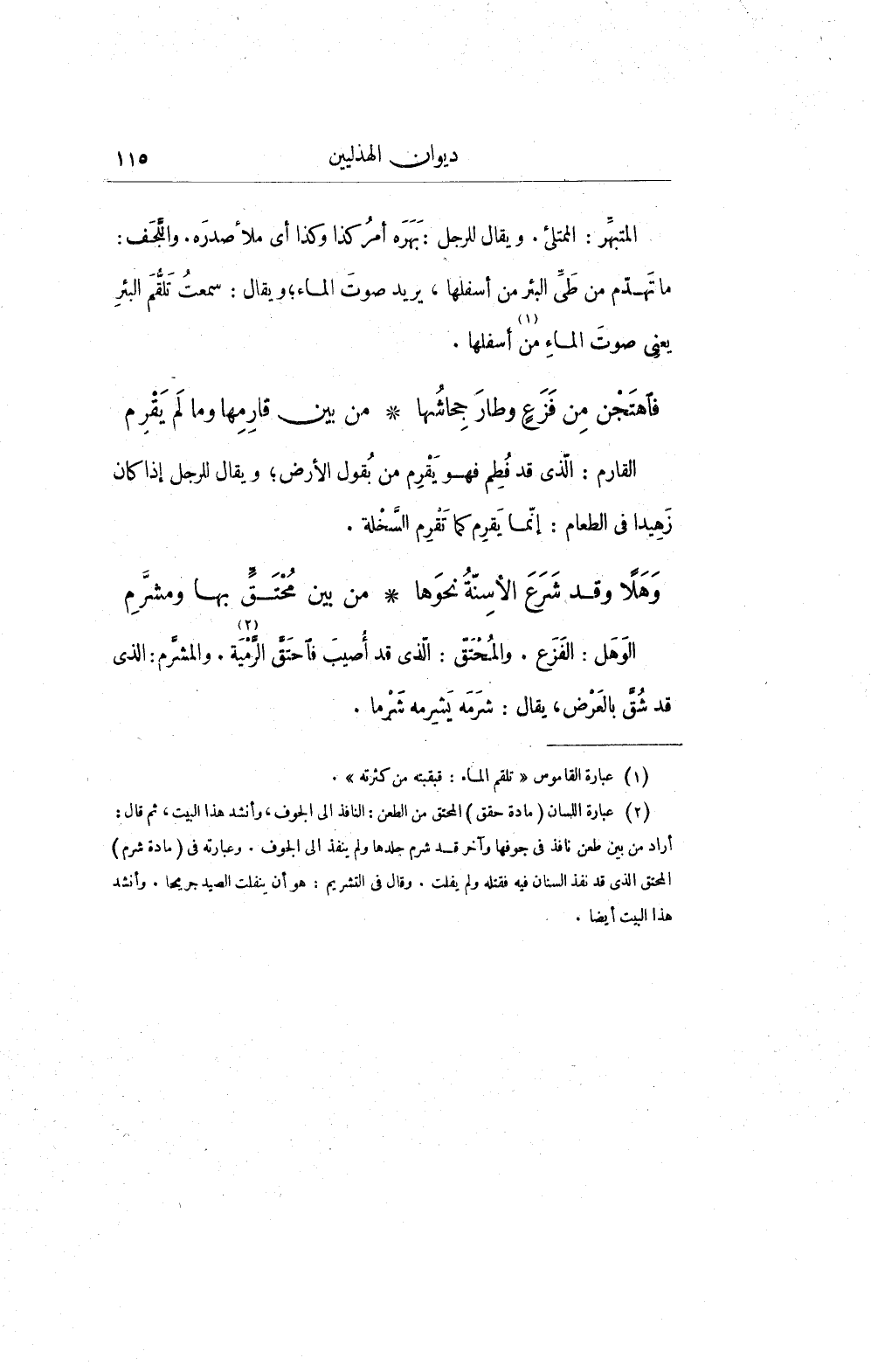 (¬2) عبارة اللسان (مادة حقق) المحتق من الطعن: النافذ إلى الجوف، وأنشد هذا البيت، ثم قال: أراد من بين طعن نافذ في جوفها وآخر قد شرم جلدها ولم ينفذ إلى الجوف. وعبارته في (مادة شرم) المحتق الذي قد نفذ السنان فيه فقتله ولم يفلت. وقال في التشريم: هو أن ينفلت الصيد جريحا. وأنشد هذا البيت أيضا.