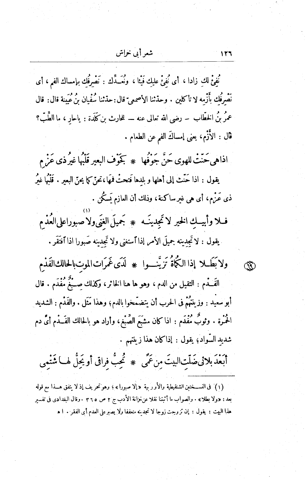 (¬1) فى النسختين الشنقيطية والأوربية "إلا صبورا"؛ وهو تحريف إذ لا يتفق هذا مع قوله بعد: "ولا بطلا". والصواب ما أثبتنا نقلا عن خزانة الأدب ج 2 ص 365. وقال البغدادى فى تفسير هذا البيت: يقول: إن تزوجت زوجا لا تجدينه متعففا ولا يصبر على العدم أي الفقر. اهـ
