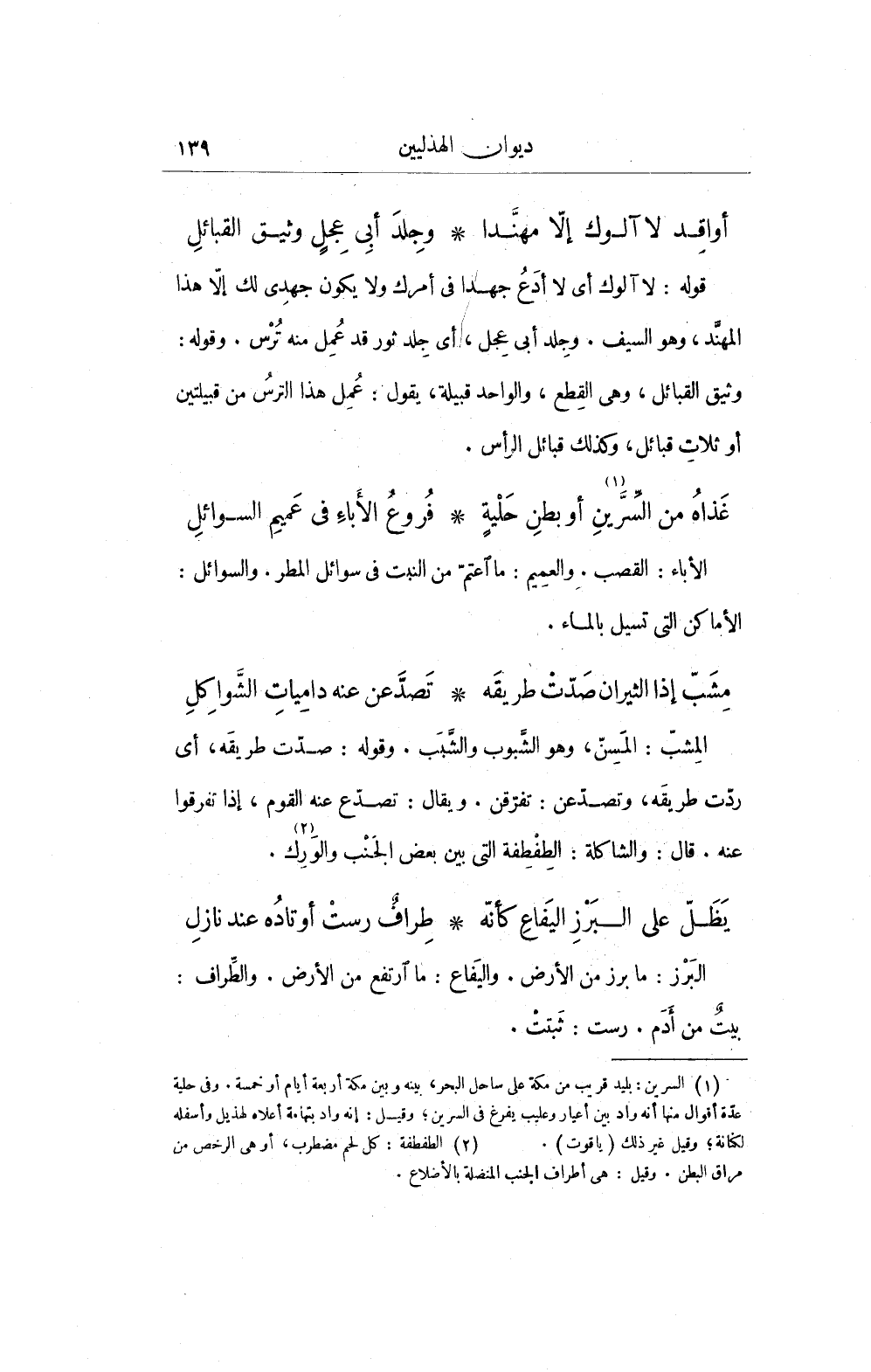 قوله: لا آلوك أي لا أدَعُ جهدا فى أمرك ولا يكون جهدِى لك إلاَّ هذا المهنَّد، وهو السيف. وجِلد أبى عِجل، أي جِلد ثور قد عُمل منه تُرْس. وقوله: وثيق القبائل، وهى القِطع، والواحد قبيلة، يقول: عُمِل هذا االترسُ من قبيلتين أو ثلاتِ قبائل، وكذلك قبائل الرأس.