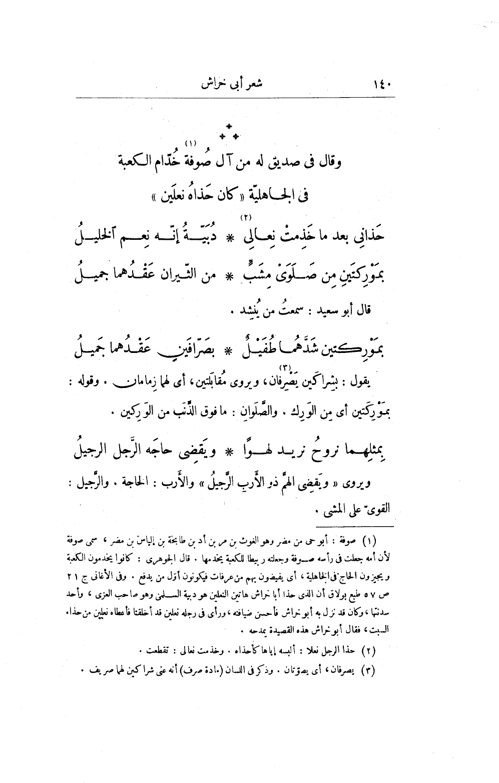 (¬1) صوفة: أبو حي من مضر وهو الغوث بن مر بن أد بن طابخة بن إلياس بن مضر، سمى صوفة لأن أمه جعلت فى رأسه صوفة وجعلته ربيطا للكعبة يخدمها. قال الجوهرى: كانوا يخدمون الكعبة ويجيزون الحاج فى الجاهلية، أي يفيضون بهم من عرفات فيكونون أوّل من يدفع. وفى الأغانى ج 21 ص 57 طبع بولاق أن الذى حذا أبا خراش هاتين النعلين هو دبية السلمى وهو صاحب العزى، وأحد سدنتها، وكان قد نزل به أبو خراش فأحسن ضيافته، ورأى فى رجله نعلين قد أخلقنا فأعطاه نعلين من حذاء السيت، فقال أبو خراش هذه القصيدة يمدحه.