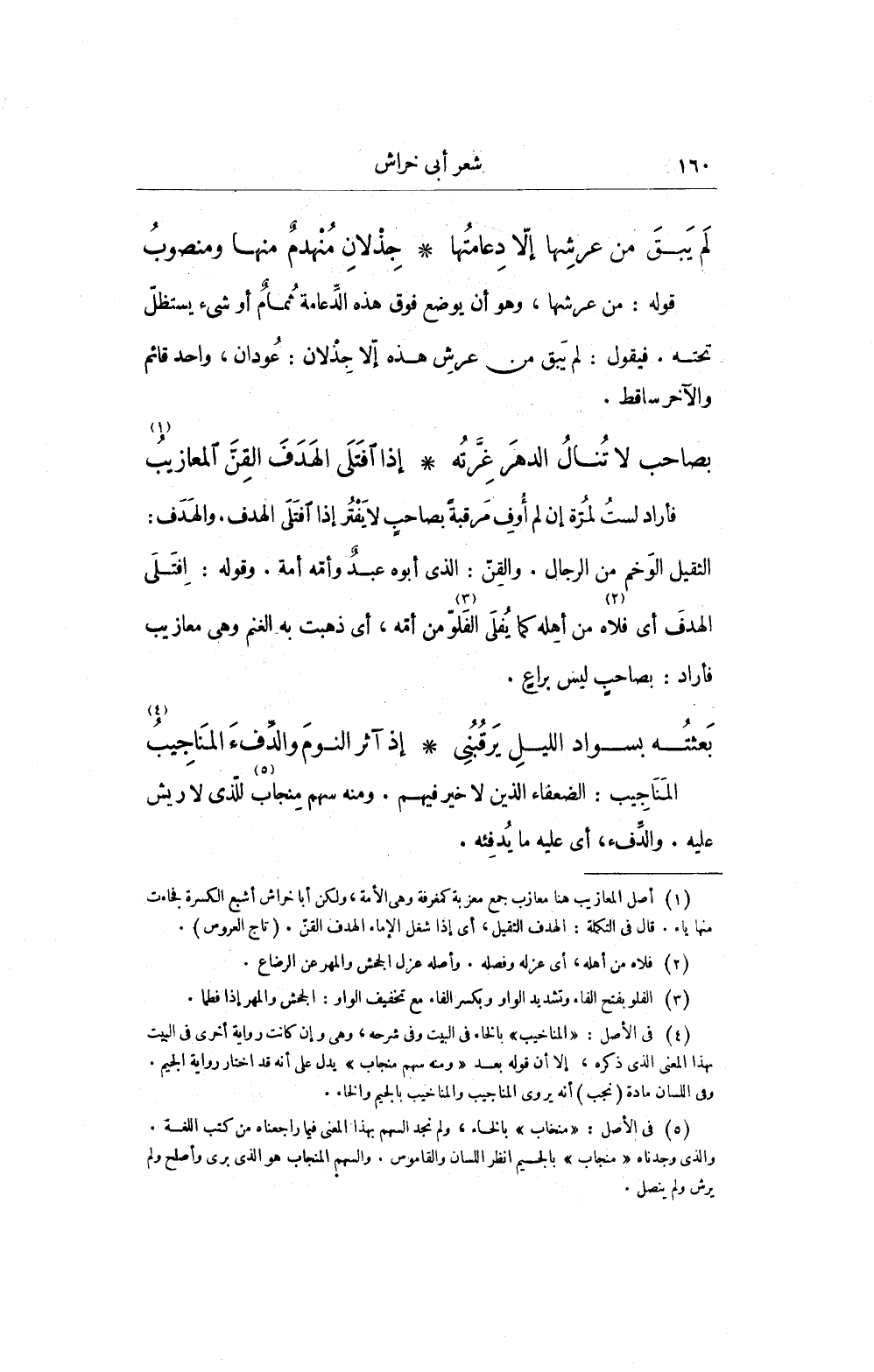 (¬1) أصل المعازيب هنا معازب جمع معزبة كمفرقة وهي الأمة، ولكن أبا خراش أشبع الكسرة فجاءت منها ياء. قال فى التكملة: الهدف الثقيل، أي إذا شغل الإماه الهدف القنّ. (تاج العروس).
