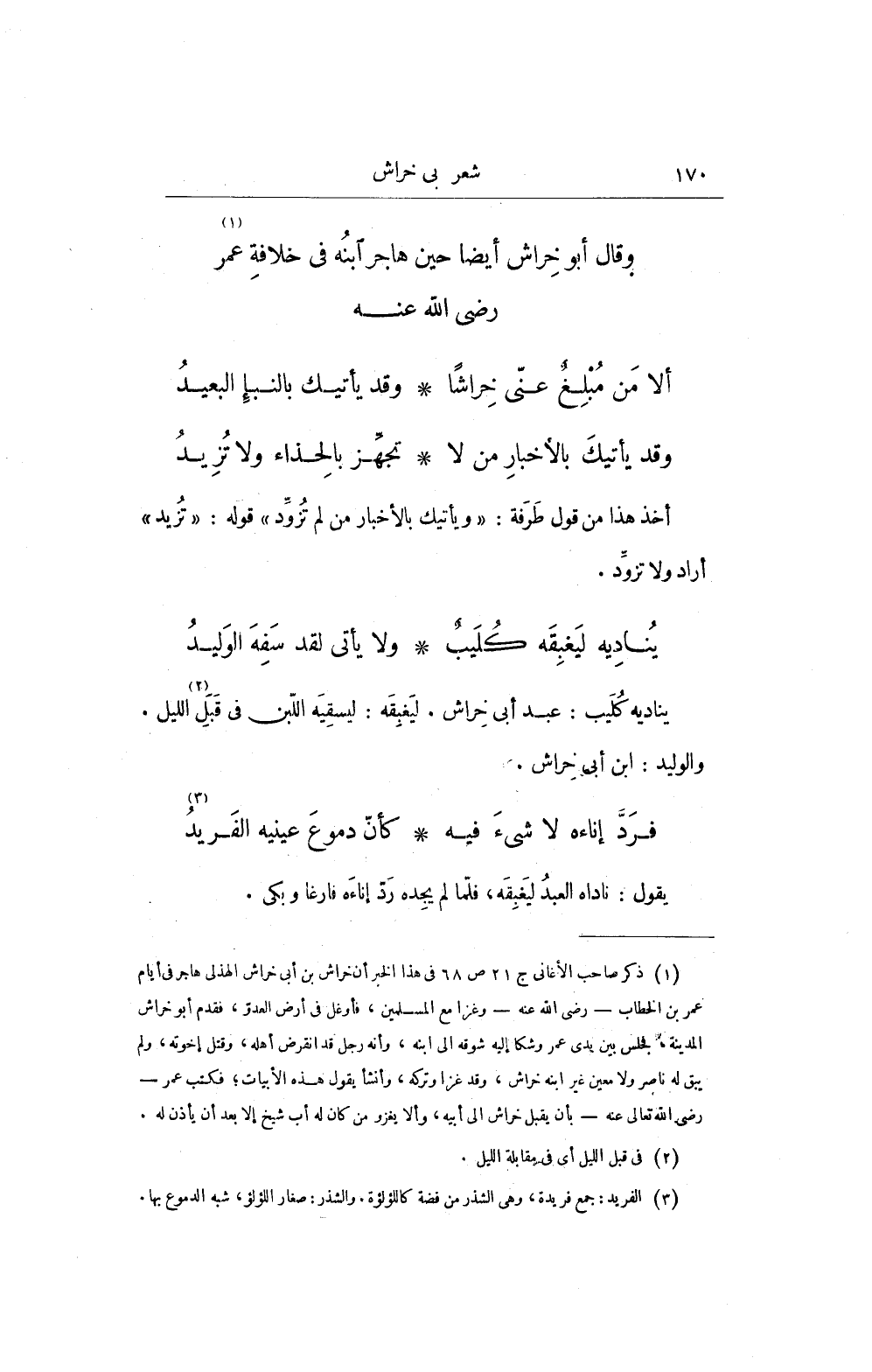 (¬1) ذكر صاحب الأغاني ج 21 ص 68 في هذا الخبر أن خراش بن أبي خراش الهذلى هاجر فى أيام عمر بن الخطاب - رضي الله عنه - وغزا مع المسلمين، فأوغل في أرض العدوّ، فقدم أبو خراش المدينة، فجلس بين يدي عمر وشكا إليه شوقه إلى ابنه، وأنه رجل قد انقرض أهله، وقتل إخوته، ولم يبق له ناصر ولا معين غير ابنه خراش، وقد غزا وتركه، وأنشأ يقول هذه الأبيات؛ فكتب عمر -رضي الله تعالى عنه- بأن يقبل خراش إلى أبيه، وألا يغزو من كان له أب شيخ إلا بعد أن يأذن له.