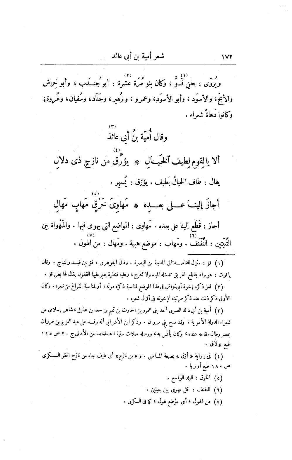 (¬3) أمية بن أبى عائذ العمرى أحد بنى عمرو بن الحارث بن تميم بن سعد بن هذيل، شاعر إسلامى من شعراء الدولة الأموية، وقد مدح بنى مروان. وذكر ابن الأعرابى أنه وفد على عبد العزيز بن مروان بمصر وطال مقامه عنده، وكان يأنس به، ووصله صلات سنية اهـ ملخصا من الأغانى ج 20 ص 115 طبع بولاق.