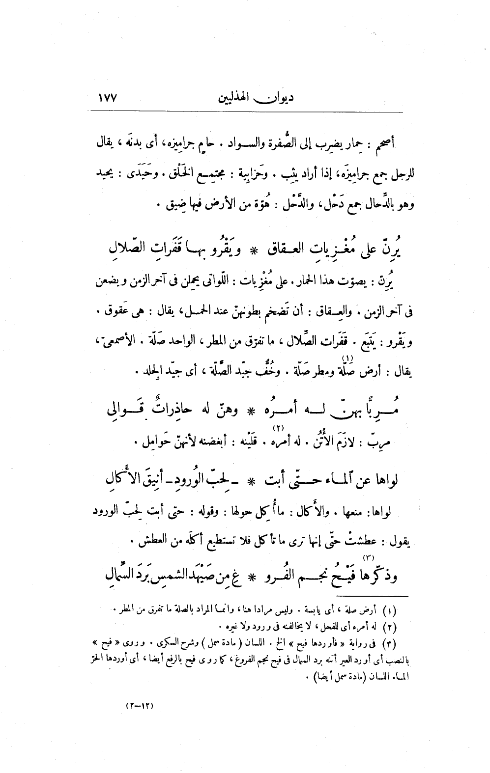 يُرِنّ: يصوّت هذا الحمار. على مُغْزِيات: اللّواتى يحمِلن في آخر الزمن ويضعن فى آخر الزمن. والعِقاق: أن تَضخم بطونهنّ عند الحمل، يقال: هي عَقوق. ويَقْرو: يَتبَع. قَفَرات الصِّلال، ما تفرَّق من المطر، الواحد صَلّة. الأصمعىّ، يقال: أرض صَلّة (¬1) ومطر صَلّة. وخُفٌّ جيّد الصِّلّة، أي جيّد الِجلد.