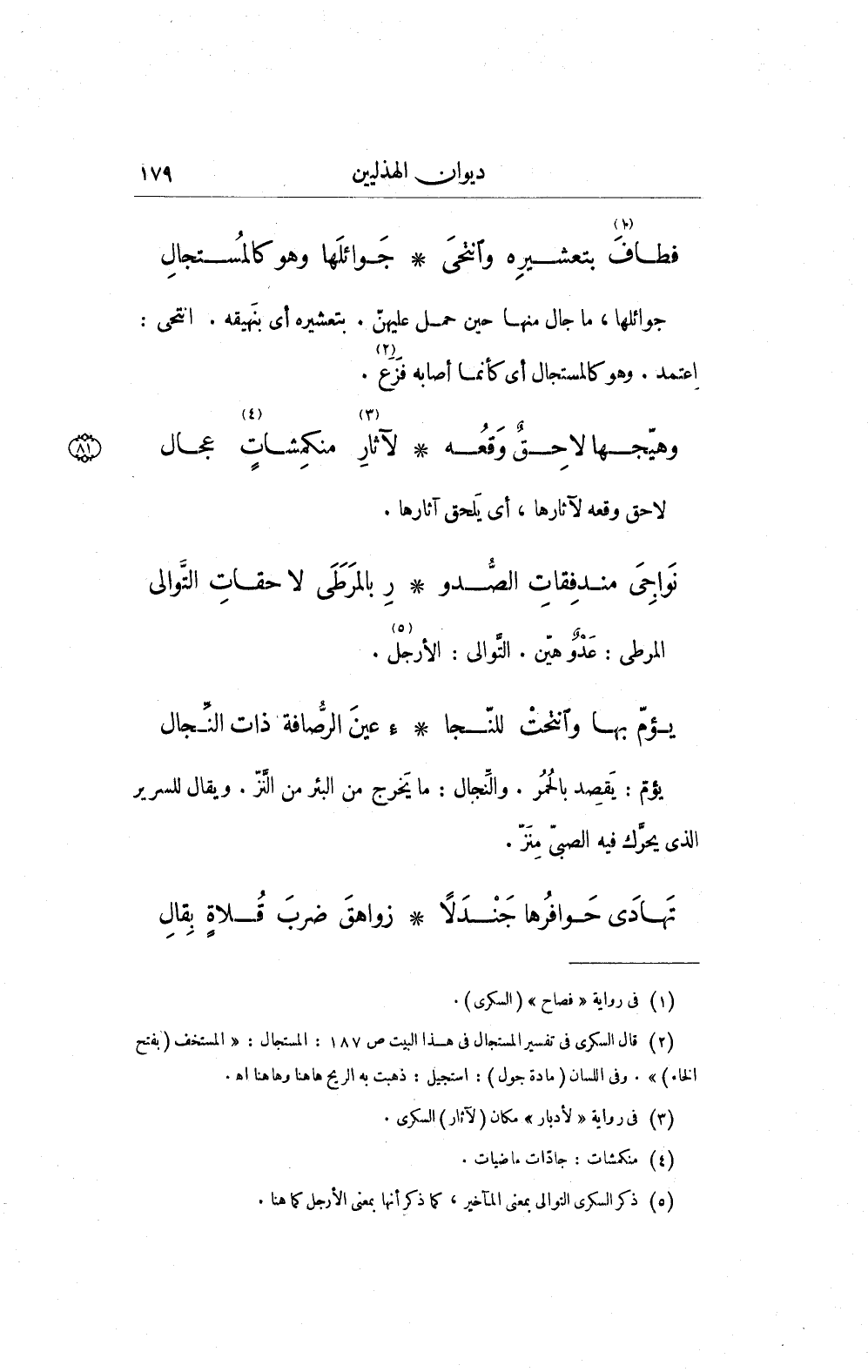 (¬2) قال السكرى فى تفسير المستجال فى هذا البيت ص 187: المستجال: "المستخف (بفتح الخاء) ". وفي اللسان (مادة جول): استجيل: ذهبت به الريح هاهنا وهاهنا اهـ.