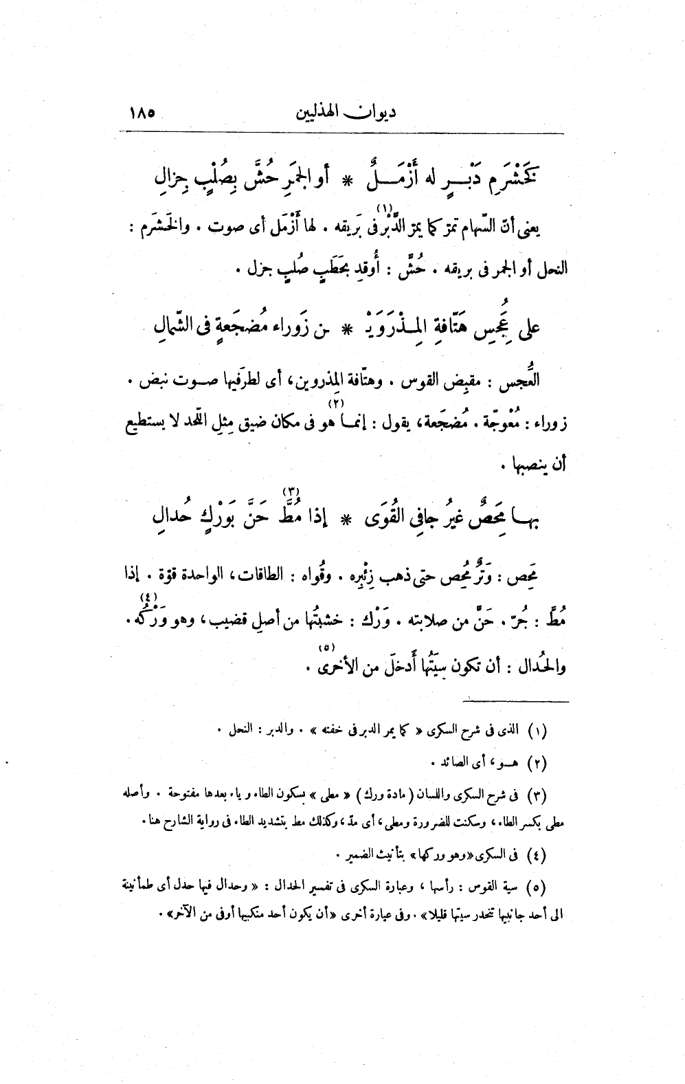 يعني أنّ السهام تمرّ كما يمرّ الدّبْر (¬1) في بَريقه. لها أزْمَل أي صوت. والخَشَرم: النحل أو الجمر في بريقه. حُشَّ: أُوقِد بحَطَبٍ صُلبٍ جزل.