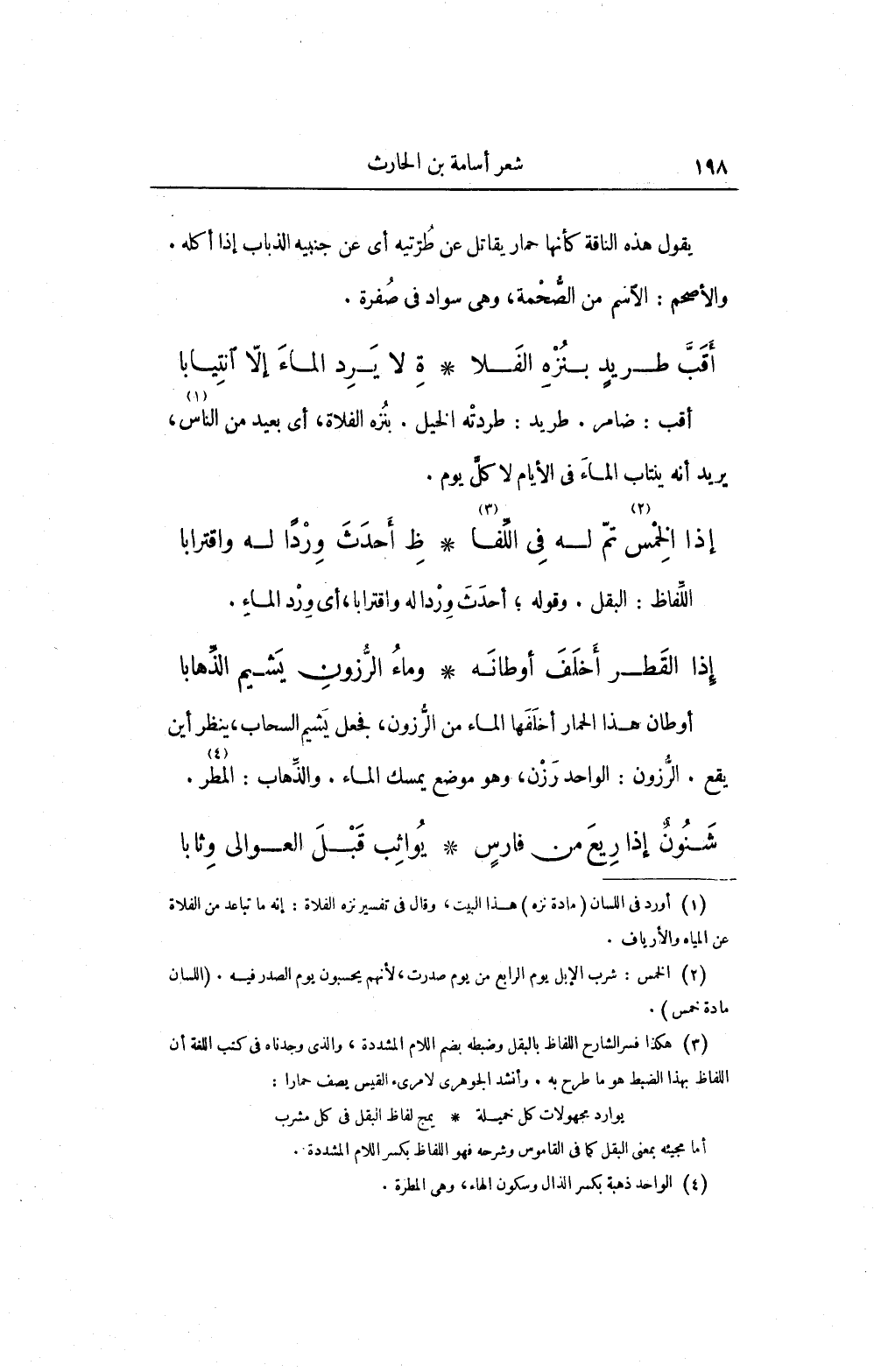 أقب: ضامر. طريد: طردتْه الخيل. بنُزه الفلاة، أي بعيد من الناس (¬1)، يريد أنه ينتاب الماءَ في الأيام لا كلّ يوم.