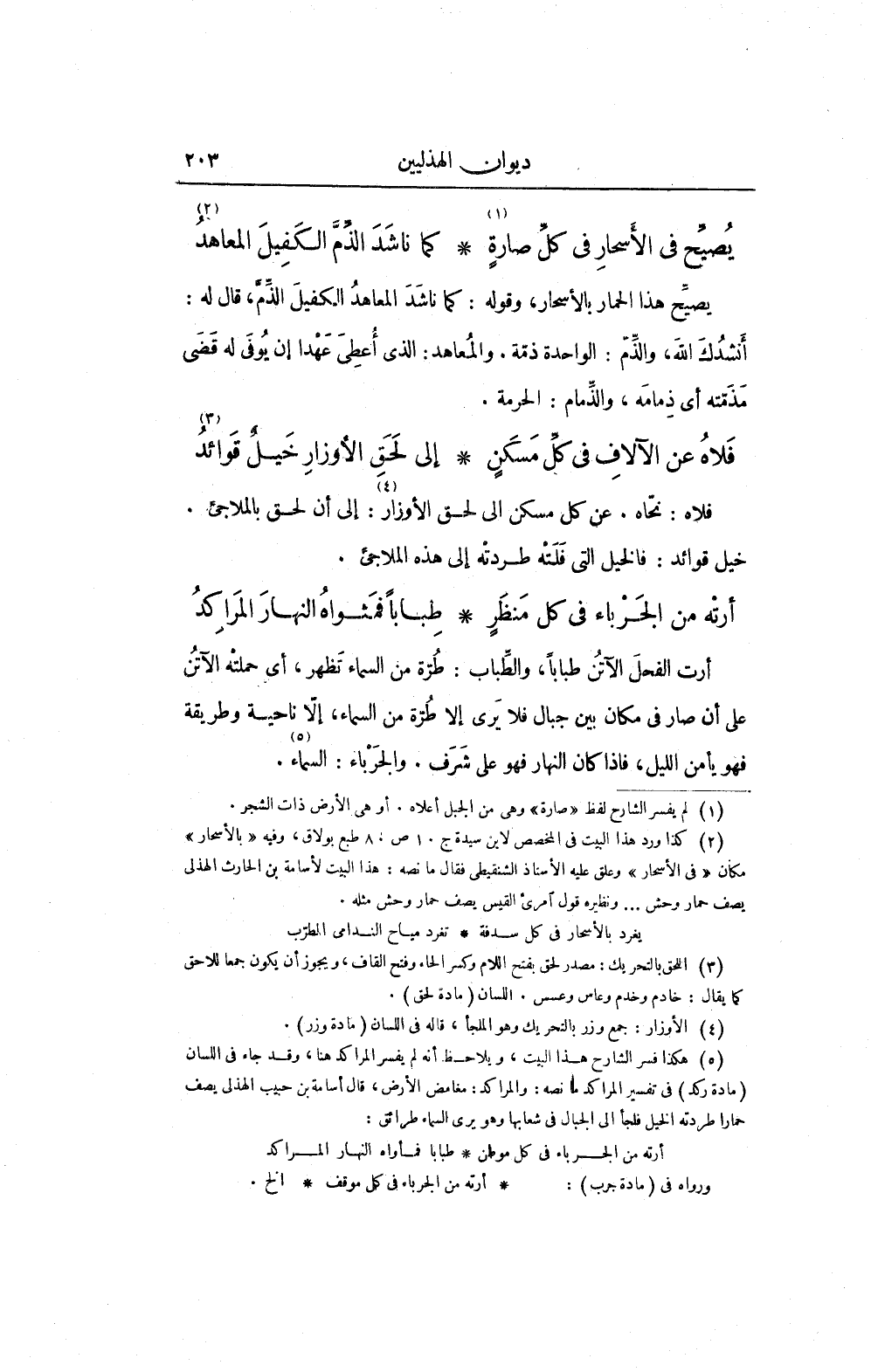 (¬5) هكذا فسر الشارح هذا البيت، ويلاحظ أنه لم يفسر المراكد هنا، وقد جاء في اللسان (مادة ركد) في تفسير المراكد ما نصه: والمراكد: مغامض الأرض، قال أسامة بن حبيب الهذلي يصف حمارا طردته الخيل فلجأ إلى الجبال في شعابها وهو يرى السماء طرائق: