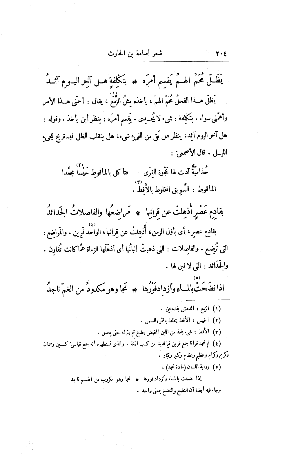 يَظلّ هذا الفحلُ مُحَمّ الهمّ، يأخذه مِثلُ (¬1) الزَّمَع، يقال: أحمني هذا الأمر وأهمّنى سواء. بتَكْلِفة: شيء لا يُجدى. يَقِسم أمرَه: ينظر أين يأخذ. وقوله: هل آخر اليوم آئِد، ينظر هل بَقي من الفيءِ شيء، هل ينقلب الظل فيستريح بمجيءِ الليل. قال الأصمعي:
