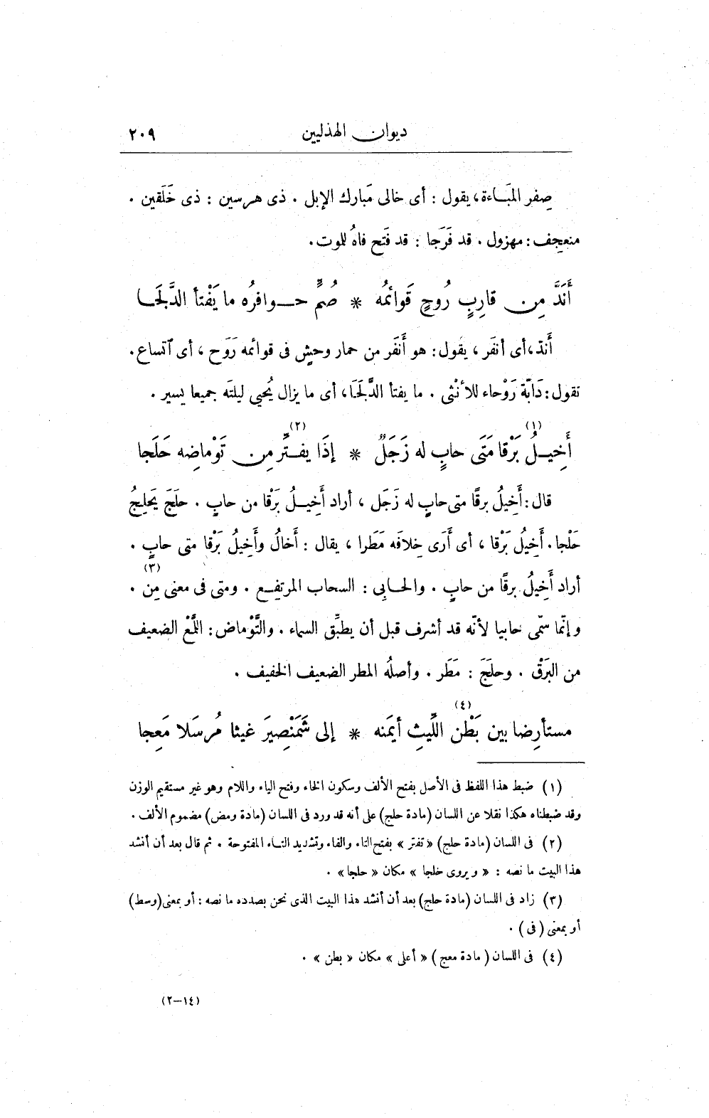 أَندّ، أي أنفَر، يقَول: هو أَنفَر من حمار وحشٍ في قوائمه رَوَح، أي اتساع. تقول: دَابّة رَوْحاء للأنْثى. ما يفتأ الدَّلَجَا، أي ما يزال يُحيى ليلتَه جميعاً يسير.