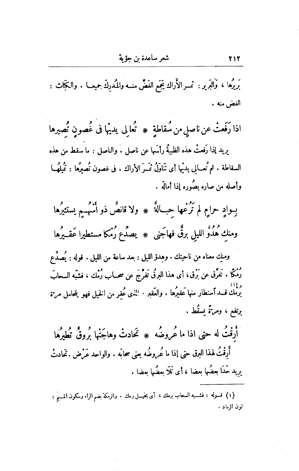يريد إذا رَفعتْ هذه الظبيةُ رأسَها عن ناصل. والناصل: ما سقط من هذه السقاطة. ثم تُعالِى يديْها أي تَناوَلُ ثمَرَ الأراك. في غصون تُصيرُها: تمُيلُها وأهله من صاره يصُوره إذا أمالهَ.