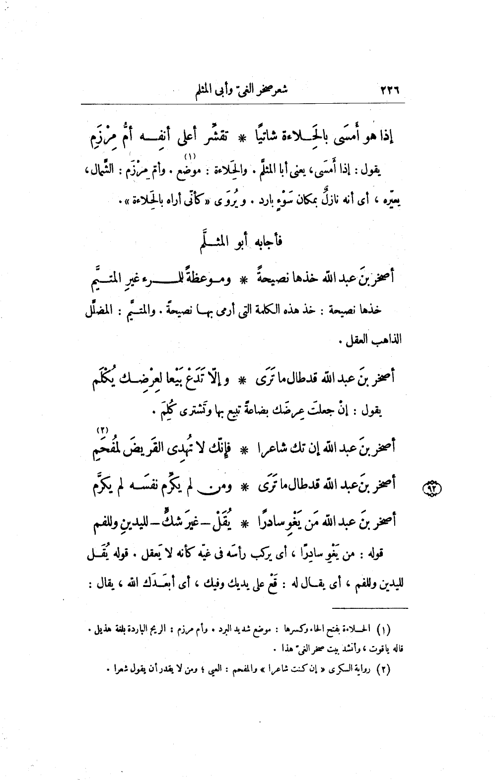 (¬1) الحلاءة بفتح الحاء وكسرها: موضع شديد البرد. وأم مرزم: الريح الباردة بلغة هذيل. قاله ياقوت، وأنشد بيت صخر الغيّ هذا.