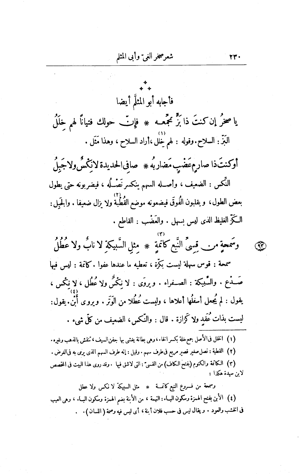 سمحة: قوس سهلة ليست بكزّة، تعطيه ما عندها عفوا. كاتمة: ليس فيها صَدْع. والسَّبيكة: الصفراء. ويروَى: لا نِكْسٌ ولا عُطُل، لا نِكْس، يقول: لم يُجعل أسفلُها أعلاها، وليست عُطُلا من الوَتَر. ويروى أَبْن (¬4). يقول: ليست بذات عُقَدٍ ولا كَزازة. قال: والنّكس، الضعيف من كلّ شيء.