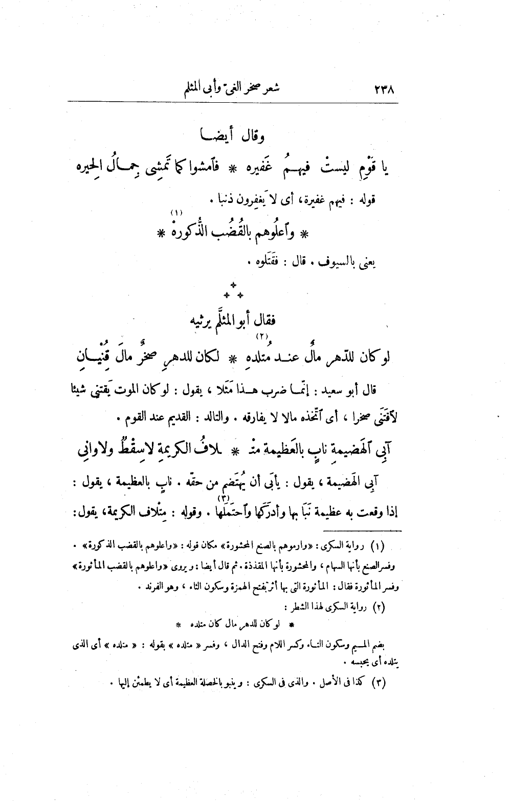 (¬1) رواية السكري: "وارموهم بالصنع المحشورة" مكان قوله: "واعلوهم بالقضب الذكورة". وفسر الصنع بأنها السهام، والمحشورة بأنها المقذذة. ثم قال أيضا: ويروى "واعلوهم بالقضب المأثورة" وفسر المأثورة فقال: المأثورة التي بها أثر بفتح الهمزة وسكون الثاء، وهو الفرند.