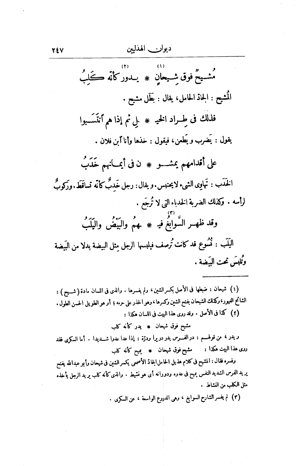 وفسره فقال: المشيح في كلام هذيل الحامل الجادّ الأصمعى يكسر الشين في شيحان وأبو عبد الله يفتح يريد الفرس الشديد النفس يميح في عدوه ودورانه أي هو نشيط. والذي كأنه كلب يريد الرجل يأخذه مثل الكلب من النشاط.